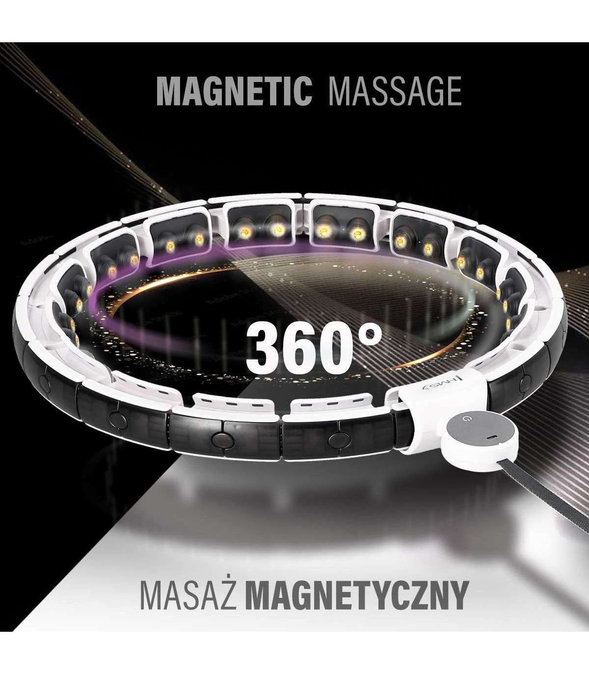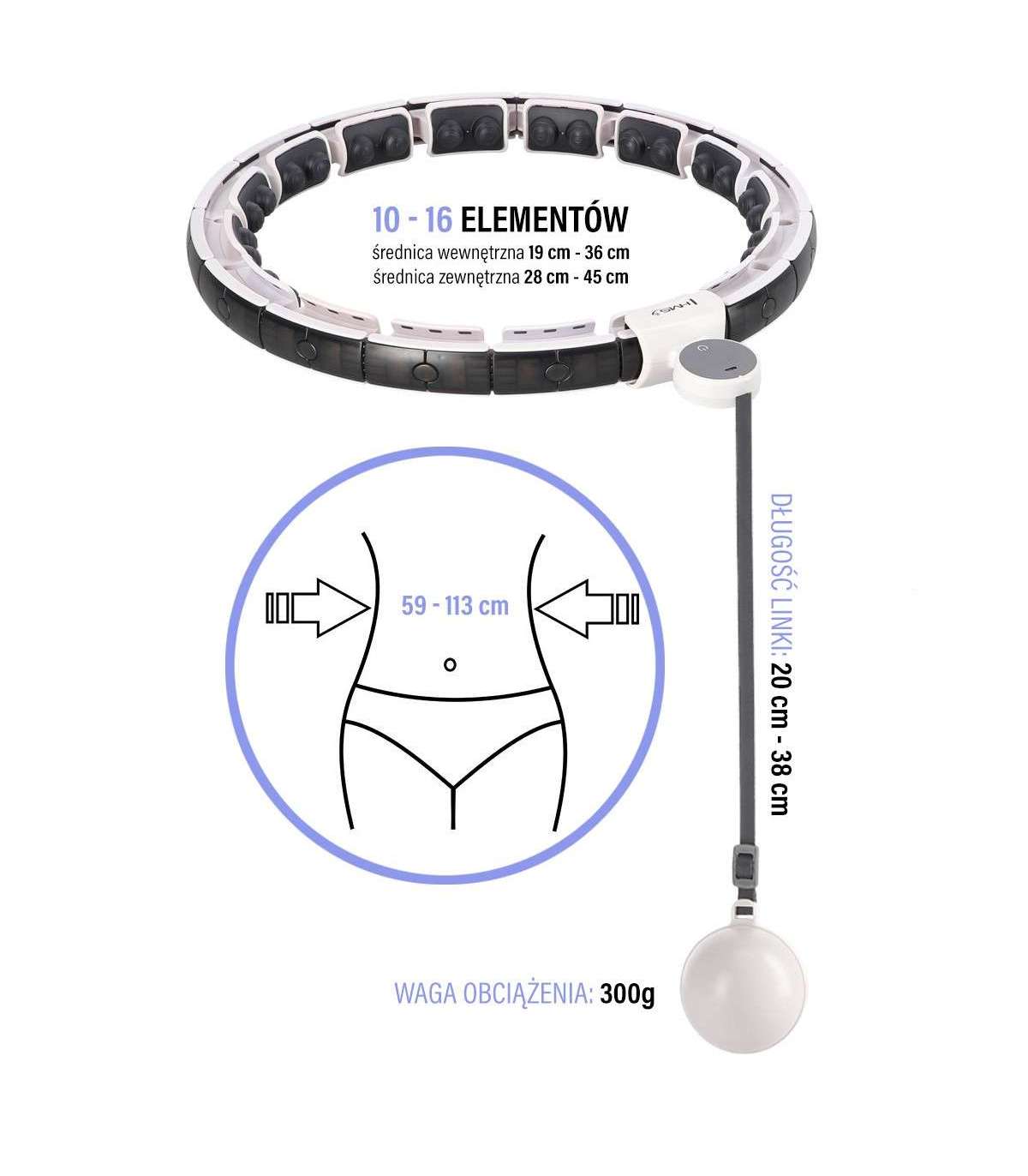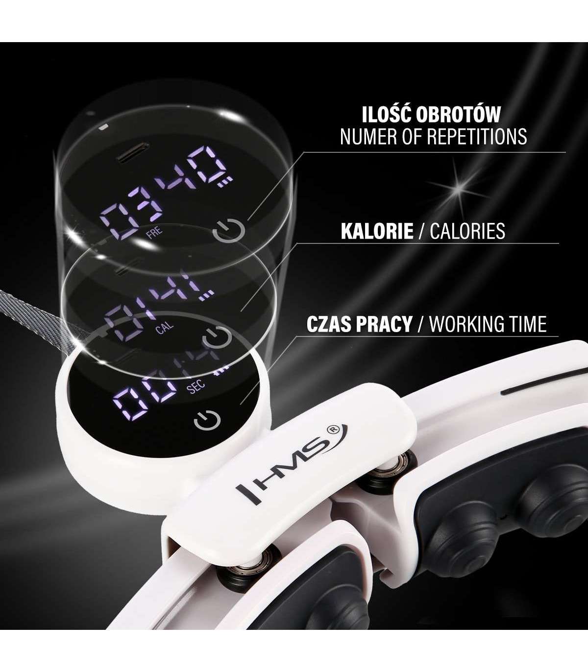SET HULA HOOP MAGNETIC WHITE HHM16 WITH WEIGHT + COUNTER HMS + WAIST SUPPORT BR163 BLACKThe HHM16 HMS is a magnetic adjustable hula-hoop with a smart USB-charged digital display and gravity fitness ball. Allows simultaneous workout and 360-degree magnetic waist massage. Allows precise measurement of parameters during the workout. As many as 32 applied magnets will allow you to take full advantage of the possibilities of the magnetic field, which positively affects metabolism and accelerates fat burning. In a set with the BR163 slimming belt, you can achieve your dream figure even faster.Magnetic 360° massageThe HHM16 magnetic hula-hoop is an excellent solution to help you fight unnecessary kilos, located in the abdominal area, hips and buttocks. The magnets, which are attached to the inner rim of the wheel, are negatively polarised. This arrangement has a stimulating effect on the metabolism. The magnets are perfectly matched in terms of power.To further enhance the action of the HHM16, there are as many as two magnets in each element of the wheel, doubling the power of the massage!The operation of the HHM16 is very simple and intuitive. It is a closed loop that has a rail with an attached gravity ball (weight). As you make circular motions with your hips, centrifugal force begins to act, which moves the gravity ball around the circle, putting the abdominal muscles and torso under tension.USB-charged digital displayThe HHM16 is equipped with an improved counter. Thanks to the use of digital technology, it is possible to accurately measure workout parameters such as the number of calories burned, running time or number of repetitions. For the sake of the environment, we have moved away from alkaline battery power in the HHM16 and started to use a rechargeable battery charged via USB type C.360° workout and massage in oneThrough the 360-degree movement performed, the springs in the heads located around the perimeter of the loop perfectly cushion the strain and adapt to the body, resulting in an additional massage effect, providing the body with a pleasant sensation. The three-dimensional massage technique quickly stimulates the muscles. The built-in specially designed tabs have shock absorption for a comfortable workout.Simple and quick perimeter adjustmentQuickly and conveniently reduce or increase the size of the wheel, simply unplug or plug in as many elements as you need. The HHM16 has a total of 16 elements. The size can be adjusted from 10 to 16 elements, i.e. waist circumference from 59 cm to 113 cm (loop diameter: 28 cm to 45 cm).The assembly is done with clips. Simply push in the clip to pull out or insert the additional element. Then insert the gravity ball rail into the loop, adjust the length of the strap and you are done. It is important not to pull out the element that houses the sensor responsible for providing data.Training intensity adjustmentAs an added bonus, the length range of the gravity ball strap can be varied to adjust the intensity and difficulty level of the workout - the longer the strap, the more strength you need to put into the workout. Adjustable from 20 cm to 38 cm. The longer the strap, the greater the centrifugal force during the exercise, i.e. more weight and a higher level of difficulty to perform the rotations.The fastest results included! The fastest training effects will be obtained by combining training on the HHM16 hula hoop with the simultaneous use of the HMS BR163 belt. Such training will allow you to model your silhouette even faster. Using the belt increases sweating during training, thanks to which we get rid not only of water from the body, but also of toxins, salts and some metals.BR163 slimming beltThanks to the elastic neoprene and Velcro fastening, the belt adapts perfectly to the body, guaranteeing full comfort. It can be used by both women and men. It facilitates perspiration wicking, ensuring that the belt will fit your body perfectly at all times. The belt has vents to wick away perspiration and can be worn for hours without the risk of chafing the skin. It ensures optimal airflow and promotes microcirculation.Universal belt sizeUsing a blend of neoprene and polyester, the drawstring is fastened with a full-length Velcro fastener. This fastening allows it to be used by people with sizes from XXS all the way up to XL. Once purchased, the belt will be able to serve us even after we have lost a lot of weight.What do you gain from training?Exercises performed with the hula-hoop and the belt will strengthen your abdominal, back and even buttock muscles. They will also help you achieve a slim waist and reduce body fat. The HHM16 is used not only for fitness training, but also for rehabilitation and correcting postural defects. Just half an hour of uninterrupted training will give you the results you want!Exercise effectsSlim waistFlatter abdomenCellulite reductionSleek armsFirm thighs and buttocksImproved blood flowImproved posture Specification:Material: PVC, ABS, PP, TPRColor: white anthraciteCircuit adjustment:10 - 16 elementsinner diameter 19 cm - 36 cmoutside diameter: 28 cm - 45 cmdiameter of a single element 4,5 cmWaist: 59cm - 113cmWeight of the load: 300g.Adjustable weighted cable:20cm - 38cmmagnets 2 in each of 16 segments Weight adjustment: yesUSB charged digital LCD displayLCD display functions: time, calories, number of repetitions, rotation speed, battery charge levelComfortable clip fasteningBall bearings, stainless steelBelt specification:Color: blackMaterial: neoprene 70%, polyester 30%Size: universalFor women and menCan be used during exercise as well as for everyday useComfortable velcro fasteningPerfect fit to the body Lenght: 100 cmRemarks:Not for commercial use24 months warrantyImporter: Abisal Ltd. | Poland | 41-807 Zabrze | Pyskowicka Street 17 | e-mail: abisal@abisal.plAbisal Ltd.. declares that the products sold by the company are safe and meet the requirements contained in the Act on General Product Safety of D