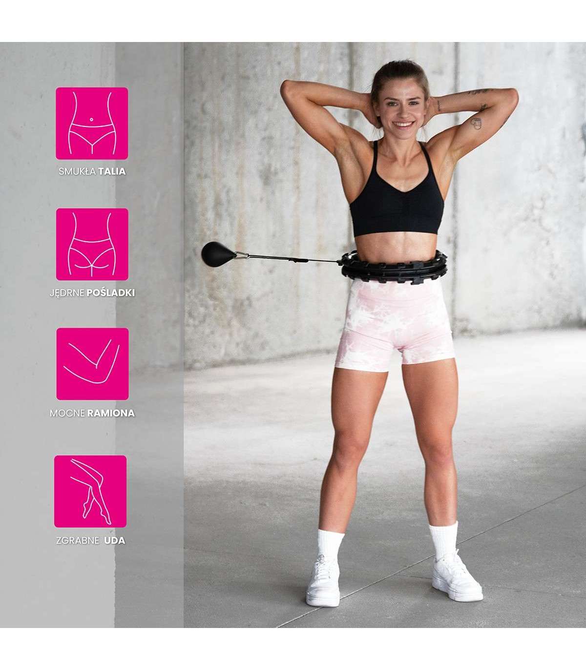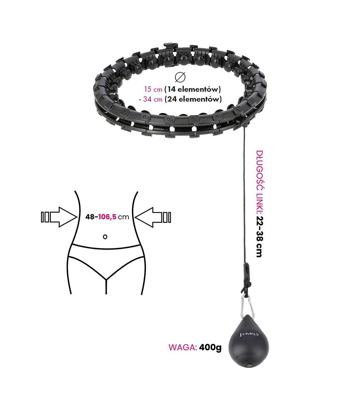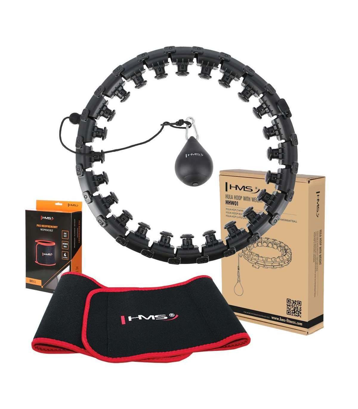 SET HULA HOOP HHW01 BLACK WITH WEIGHT HMS + WAIST SUPPORT BR163 RED HHW01 HMS is an adjustable hula-hoop with vibration-absorbing tabs and gravity ball for fitness. It allows for a simultaneous workout and 360-degree waist massage. It is perfect for strengthening and firming the muscular corset, among other things. Thanks to its adjustable circumference, the HHW01 will never fall off during exercise, so your home cardio workout can be long and enjoyable, guaranteeing even better results! Combined with the BR163 slimming belt, you can achieve your dream figure even faster. How does HHW01 work? The operation of HHW01 is very simple and intuitive. It is a closed loop that has a rail with an attached gravity ball (weight). As you make circular movements with your hips, a centrifugal force starts to act, which moves the gravity ball around the circle, putting your abdominal muscles and torso under tension.Note: the brace should be tightly closed before use. Training and massage in one Through a 360-degree movement, the springs in the heads located around the perimeter of the loop perfectly cushion the strain and adapt to the body, resulting in an additional massage effect, providing the body with a pleasant sensation. The three-dimensional massage technique quickly stimulates the muscles. The built-in specially designed tabs have shock absorption for a comfortable workout. Dose the intensity of the vibrations by the speed of rotation. Adjustable circumference Quickly and conveniently reduce or increase the size of the wheel, simply unplug or plug in as many elements as you need. HHW01 has a total of 24 elements. The size can be adjusted from 14 to 24 elements, i.e. waist circumference from 48 cm to 106.5 cm (loop diameter: 26 cm to 45 cm). This ensures that the device will never fall off during a workout, so even beginners can use it. Strap adjustment An additional advantage is that the strap length range of the gravity ball can be changed. This ranges from 22 cm to 38 cm. The longer the strap, the greater the centrifugal force during the exercise, i.e. the greater the weight and the higher the level of difficulty of the rotation. Comfort of use The device has a construction made of high-quality PVC. The rail is set on ball bearings, which are made of stainless steel. All this together makes the rotation flexible and uninterrupted which further enhances the feeling of satisfaction during training. In addition, the gravity ball is covered in soft rubber and is filled with sand inside, thus increasing safety for the exerciser and the environment. Compact size and easy assembly The loop is opened with magnet clips. Then, to connect the subsequent elements, slide one element into the other so that the tabs go into the corresponding holes. When reducing the elements, grasp the corresponding element with one hand and squeeze in such a way that the tabs slide out of the holes. Then insert the gravity ball rail into the loop, close the magnet clips, adjust the length of the strap and you are done. Plus, thanks to its compact size it is easy to carry, you can take this product with you anywhere. With the slimming belt, the results will come faster! Your workout will be more effective if you use our BR163 slimming belt during it. This combination will sculpt your silhouette even faster. The use of the belt increases sweating during your workout, thus getting rid of not only water from your body, but also toxins, salts or certain metals. The BR163 also provides greater comfort, which will allow you to extend your workout. It helps to shape the silhouette, reduce cellulite and firm the skin. BR163 slimming belt Thanks to the elastic neoprene and Velcro fastening, the belt adapts perfectly to the body, guaranteeing full comfort. It can be used by both women and men. It facilitates perspiration wicking, ensuring that the belt will fit perfectly on your body at all times. The belt has vents to wick away perspiration and can be worn for hours without the risk of chafing the skin. It ensures optimal airflow and promotes microcirculation. Universal belt size Using a blend of neoprene and polyester, the drawstring is fastened with a full-length Velcro fastener. This fastening allows it to be used by people with sizes from XXS all the way up to XL. Once purchased, the belt will be able to serve us even after losing a lot of unnecessary kilograms. Advantages of training with the hula-hoop First and foremost, training with HHW01 will slim the abdomen and slim the waist. It will also contribute to the reduction of fat tissue from the thighs and buttocks area. Another benefit through the strengthening of the abdominal muscles and trunk will be a marked improvement in the exerciser's posture. Just half an hour of continuous training with HHW01 is equivalent to one hour of swimming and three hours of running! Exercise effects Slim waistFlatter abdomenCellulite reductionSleek armsFirm thighs and buttocksImproved blood flowImproved postureSpecification:Material: PVC, ABSColor: blackCircuit adjustment:14 - 24 elements (diameter 26cm - 45cm)Waist: 46cm - 105cminner diameter: 15 cm - 34 cmexternal diameter: 26 cm - 45 cmdiameter of one element: 5.5 cmWeight of the load: 400g.Belt adjustment with load:22cm - 38cmConvenient clip fastening with a magnetBall bearings, stainless steelBelt specification:Color: black-redMaterial: neoprene 70%, polyester 30%Size: universalFor women and menCan be used during exercise as well as for everyday useComfortable velcro fasteningPerfect fit to the body Lenght: 100 cmRemarks:Not for commercial use24 months warrantyImporter: Abisal Ltd. | Poland | 41-807 Zabrze | Pyskowicka Street 17 | e-mail: abisal@abisal.plAbisal Ltd.. declares that the products sold by the company are safe and meet the requirements contained in the Act on General Product Safety of December 12, 2003. (Journal of Laws of December 31, 2003)