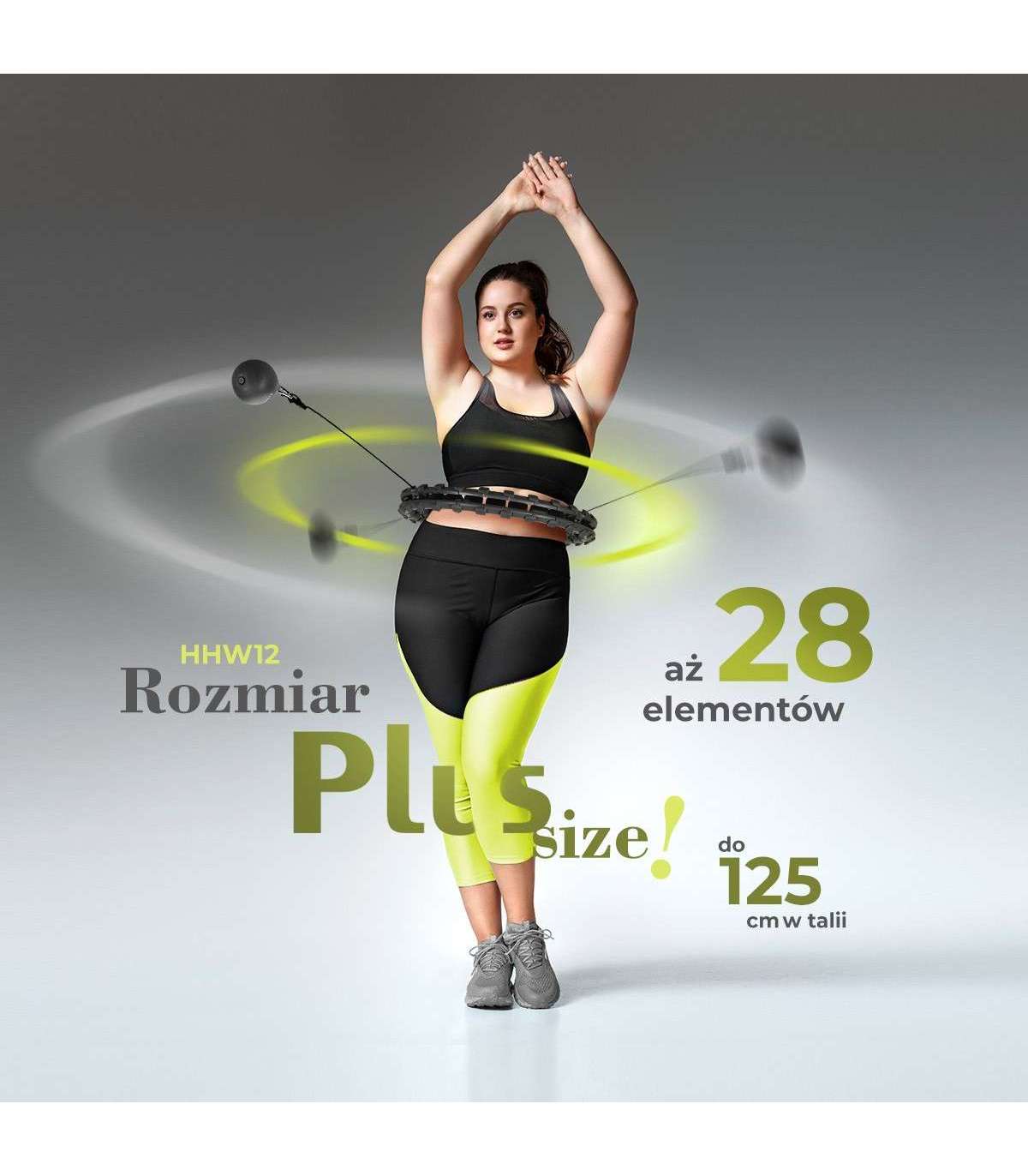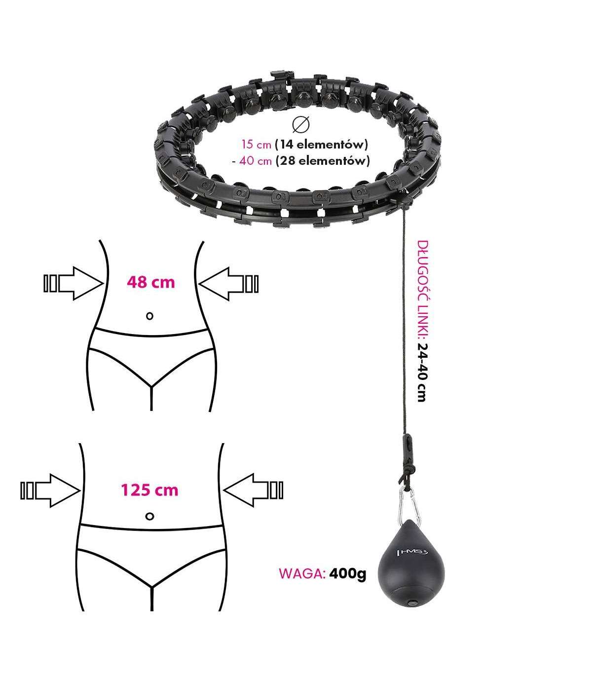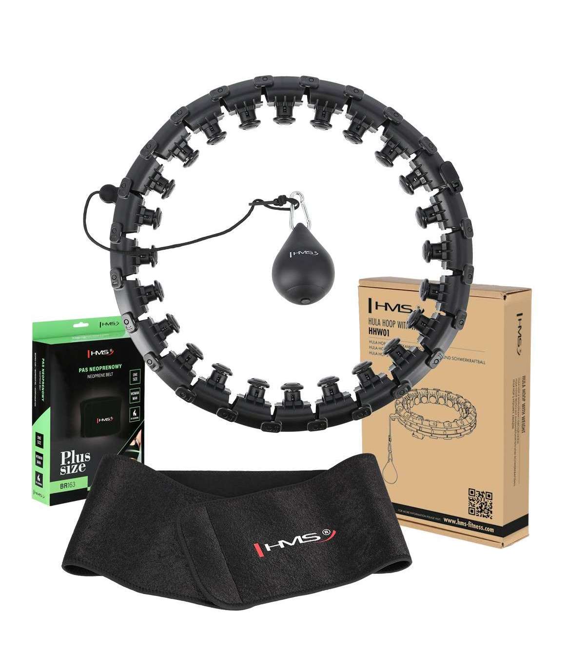 SET HULA HOOP HHW12 BLACK WITH WEIGHT HMS + WAIST SUPPORT BR163 BLACK PLUS SIZEThe HHW12 HMS Plus Size is an adjustable hula hoop with vibration-absorbing nubs and a gravity ball for fitness. Allows you to train and massage your waist 360 degrees at the same time. It is perfect incl. to strengthen and firm the muscle corset. Thanks to the adjustable circuit, the HHW12 will never fall off during exercise, which is why home cardio training can be long and enjoyable, which guarantees even better results! In the set with the BR163 PLUS SIZE slimming belt, you can achieve your dream figure even faster.Size adjustable from XS to XXL!Who is HHW12 Plus Size for?HHW12 is the perfect choice for people with a waist circumference of more than 105 cm. The increased adjustability of the HHW12 will allow people with a waist circumference of 48 to even 125 cm to train. Thanks to such a wide range of adjustments, the equipment is also ideal as a family equipment, on which both adults and children will be able to exercise.How does HHW12 Plus Size work?The operation of the HHW12 is very simple and intuitive. It is a closed loop that has a rail with a gravity ball (weight) attached. When making circular movements with the hips, centrifugal force begins to work, which moves the gravity ball in a circle, bringing the abdominal and torso muscles into a state of tension.Training and massage in oneThrough the performed 360-degree movement, the springs located in the heads located around the entire perimeter of the loop perfectly absorb overloads and adapt to the body, which causes an additional massage effect, providing the body with a pleasant feeling. The three-dimensional massage technique quickly stimulates the muscles. Built-in tabs with a specially designed design have shock absorption for a comfortable workout. Circuit adjustmentIn a quick and convenient way to reduce or increase the size of the wheel, just disconnect or connect as many elements as you need. HHW12 has a total of 28 elements. The size can be set from 14 to 28 pieces, i.e. waist circumference from 48 cm to 125 cm (loop diameter: 26 cm to 51 cm). Thanks to this, the device will never fall during training, so even beginners can use it.Strap adjustmentAn additional advantage is the ability to change the length of the gravity ball belt. It ranges from 24 cm to 40 cm. The longer the bar, the greater the centrifugal force during exercise, i.e. the greater the weight and the higher the difficulty of rotation.Comfort of useThe device has a structure made of high-quality PVC. The rail is mounted on ball bearings made of stainless steel. All this together makes the rotation flexible and uninterrupted, which further enhances the feeling of satisfaction during training. In addition, the gravity ball is covered with soft rubber, and the inside is filled with sand, thus increasing safety for the exerciser and the environment.Compact size and easy installationThe loop is opened with magnet clips. Then, to connect subsequent elements, slide one element into the other so that the protrusions fit into the appropriate holes. When reducing elements, grab the appropriate element with one hand and squeeze in such a way as to pull the tabs out of the holes. Then slide the rail with the gravity ball into the loop, close the clips with the magnet, adjust the length of the strap and you're done.With a slimming belt, the effects will come faster!Your training will be more effective if you use our slimming belt BR163 during it. Such a combination will sculpt your figure even faster. The use of the belt increases sweating during training, thanks to which we get rid of not only water from the body, but also toxins, salts and some metals. The BR163 also provides greater comfort, which will allow you to extend your training. It helps to model the figure, reduce cellulite and firm the skin.BR163 slimming beltThanks to the flexible neoprene and Velcro fastener, the welt adapts perfectly to the body, guaranteeing full comfort. It can be used by both women and men. It facilitates the drainage of sweat, which means that the belt will adhere perfectly to your body at all times. The belt has vents to wick away sweat and can be worn for many hours without the risk of chafing the skin. It ensures optimal air flow.Belt size: PLUS SIZEUsing a blend of neoprene and polyester, the drawstring is fastened with Velcro along its entire length. This fastening allows it to be used by people with sizes up to XXL! Once purchased, the belt will be able to serve us even after we have lost many unnecessary kilograms.Benefits of hula hoop trainingFirst of all, training with HHW12 will slim the belly and slim the waist. It will also contribute to the reduction of fat around the thighs and buttocks. Additionally, it will help strengthen the shoulder girdle and arms. Another advantage by strengthening the abdominal and torso muscles will be a clear improvement in the posture of the exerciser.Exercise effectsSlim waistFlatter abdomenCellulite reductionSleek armsFirm thighs and buttocksImproved blood flowImproved postureSpecification:Material: PVC, ABSColor: blackCircuit adjustment:14 - 28 elements inner diameter 15 cm - 40 cmouter diameter 26 cm - 51 cmdiameter of one element 5,5 cmWaist: 46 cm - 125 cmWeight of the load: 400 g.Belt adjustment with load:24 cm - 40 cmConvenient clip fastening with a magnetBall bearings, stainless steelShock absorption: YESWeight of the hula hoop: 1375 g.Dimensions in the package: height 44,5 cm x width 31,5 cm x depth 8 cmBelt specification:Color: blackMaterial: neoprene 70%, polyester 30%Size: plus sizeFor women and menCan be used during exercise as well as for everyday useComfortable velcro fasteningPerfect fit to the bodyLenght: 130 cmRemarks:Not for commercial use24 months warrantyImporter: Abisal Ltd. | Poland | 41-807 Zabrze | Pyskowicka Street 17 | e-mail: abisal@abisal.plAbisal Ltd.. declares that the products sold by the company are safe and meet the requirem