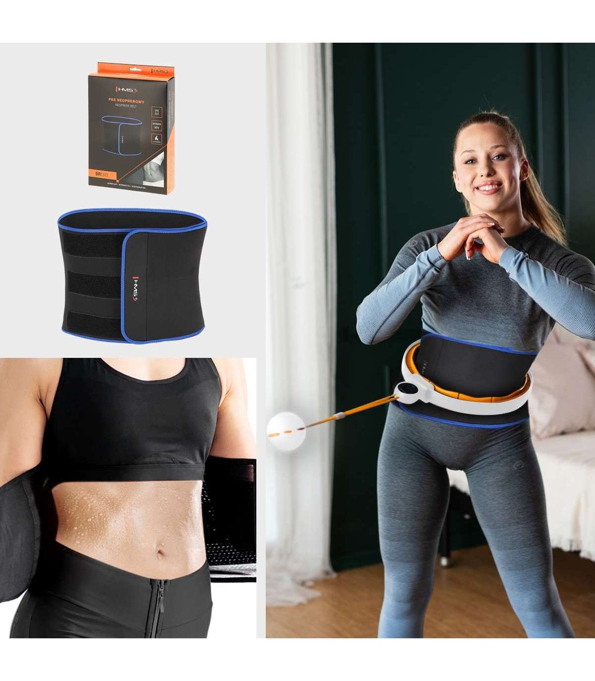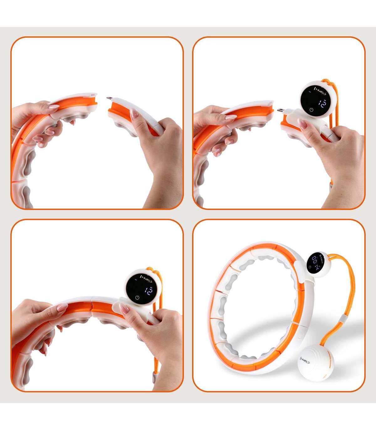 SET HULA HOOP MAGNETIC WHITE/ORANGE HHM21 WITH WEIGHT + COUNTER HMS + SLIMMING BELT BR1313Introducing the HHM21 - the latest addition to the HMS hula-hoop line-up, designed for maximum efficiency and comfort. Every element of this model has been thoughtfully designed to deliver the ultimate workout experience. Complete with the BR1313 slimming belt, you'll improve your physique even faster!Innovative TPE tabs for extra comfortThe Hula-hop HHM21 is equipped with innovative tabs made of flexible thermoplastic elastomer (TPE), which significantly increases comfort during use. The flexibility and durability of TPE, as well as its hypoallergenic properties, allow for safe and comfortable workouts, providing a firm grip and gentle massage during rotation.Easy to assemble thanks to the four-piece designThe HHM21 features ease of assembly thanks to its four-piece design, making it ideal for both home and travel use. Its compact design makes it easy to both assemble and store, providing convenience of use no matter where you are.Durability ensured by metal latchesThe use of metal joints on the HHM21 significantly increases its durability and stability. The metal latches guarantee a strong connection of the components, which translates into the longevity of the device and safety during the most intense exercises.Digital display with USB-C chargingThe HHM21 features a state-of-the-art digital display to monitor key workout parameters such as time, calories burned and number of revolutions. In addition, the integrated USB-C connector allows for easy charging of the device, a significant convenience for everyday use.New generation of weight ballThe newly designed weight ball of the HHM21 model not only catches the eye with its modern design, but also increases the efficiency of your workout thanks to its aerodynamic shape, which allows for better control and more efficient movements.Magnetic functions for optimal resultsLike the other models in the HHM range, the HHM21 hula-hop uses magnetic technology to improve the efficiency of your workout. The built-in magnets accelerate fat burning and promote metabolism, making workouts with the HHM21 particularly effective for body shaping and fat reduction.Combination with slimming belt BR1313By combining workouts with the HHM21 hula-hoop and the BR1313 slimming belt, you can achieve even better results. When used together, these two tools strengthen the abdominal, back and buttock muscles, accelerate fat reduction and help you achieve a slim waistline. The BR1313 additionally promotes calorie burning and improves blood circulation, accelerating the desired results.Specification:HULA HOP HHM21Material: PC+ABS+PP+TPE+magnet+metalMassaging tabs: made of thermoplastic elastomer (TPE)Metal connections of the elementsColour: White and orangeCircuit adjustment: 1-4 elementsInner circumference (waist): 71 cm - 106 cmExternal circumference: 99 cm - 134 cmWeight of the load: approx. 350 gMagnets: 2 in each elementLoad filling: four iron platesStrap length with load: 23 cmUSB-C charging: yes Rechargeable battery charging time: 2 hours Continuous operating time: 6.5 hoursDisplay functions: