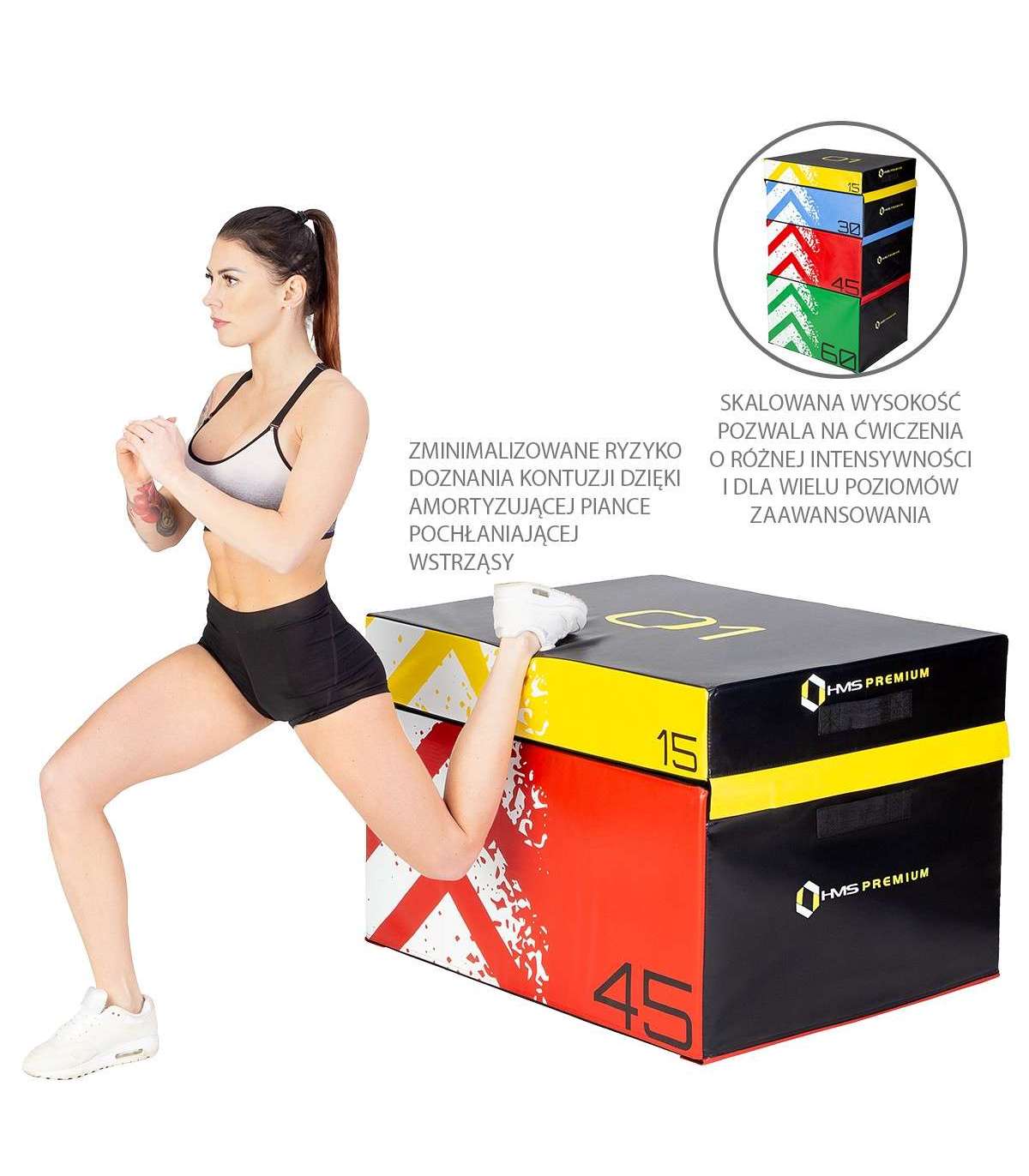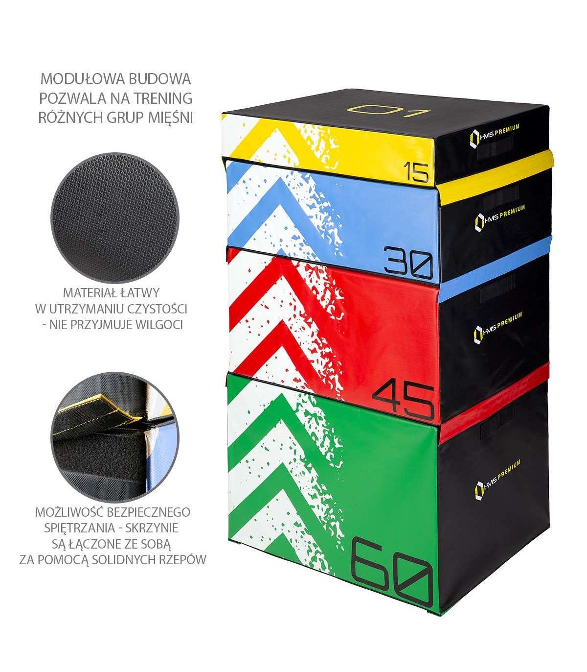 PYBS01 HMS ящики изготовлены из прочных материалов, поэтому они достаточно жесткие и одновременно мягкие, чтобы защитить пользователя от возможных травм. Чтобы получить три разные высоты и одновременно разные площадки для упражнений, достаточно повернуть ящик. Элементы можно свободно комбинировать друг с другом и складывать друг на друга без опасений опрокидывания. Поэтому возможно постоянное развитие навыков и уровня физической подготовки. Ящики рассчитаны на самые интенсивные тренировки; они также устойчивы к поту и влаге.