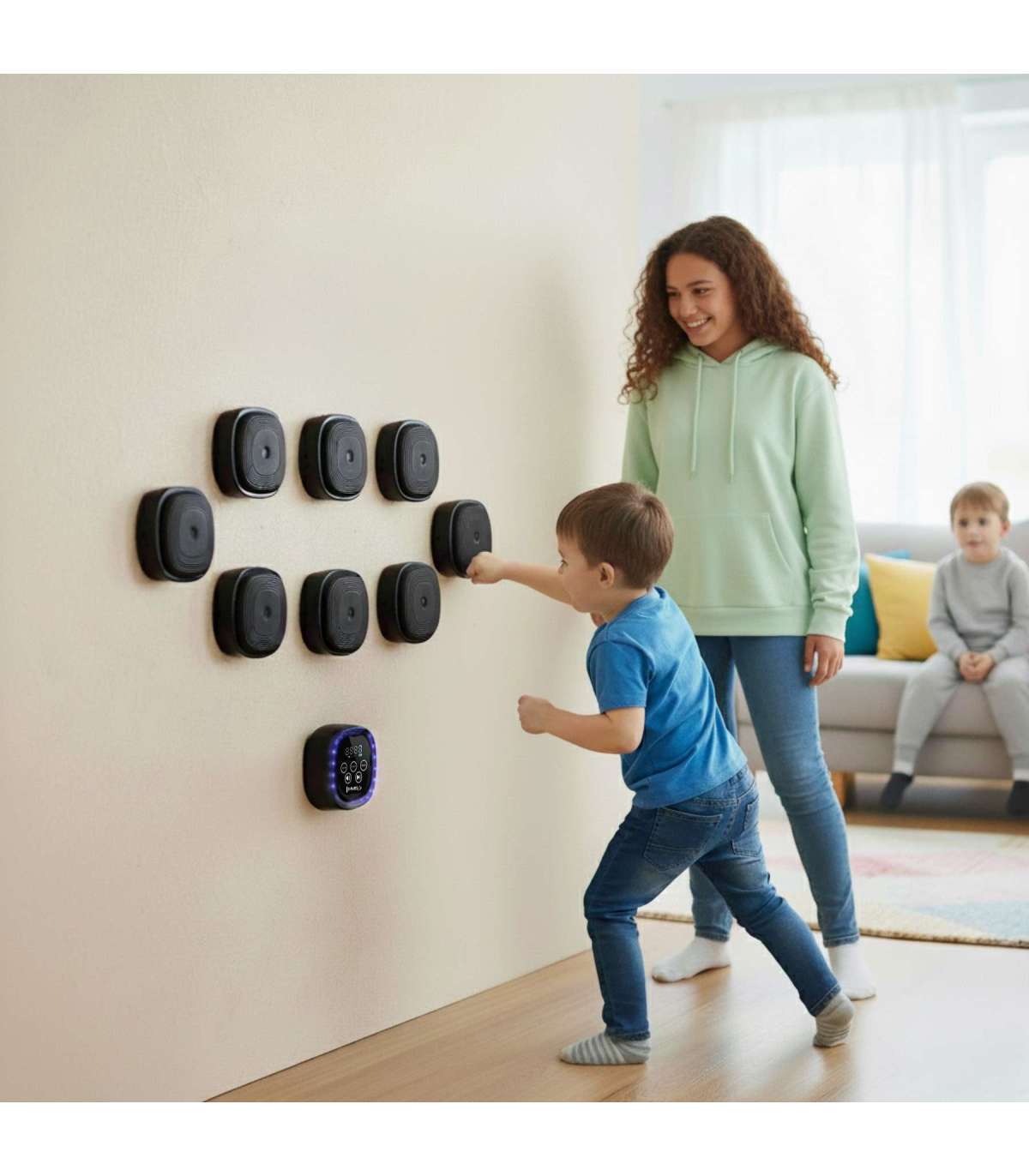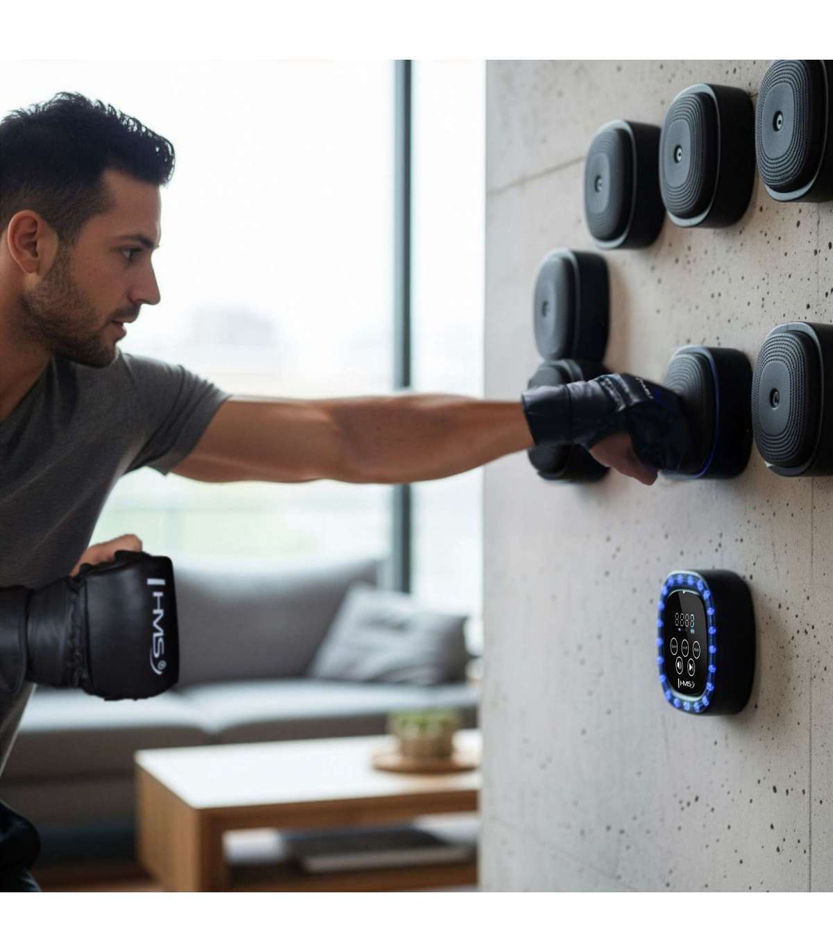 TB05 MODULAR MUSIC BOXING MACHINE BLUETOOTH WITH GLOVES HMSBuild your own wall ring! The TB05 HMS is a modular LED boxing target with Bluetooth that you can arrange in any configuration using 9 modules. The LED lights indicate the strike zone, the speaker plays music, and the counter tracks repetitions, calories and time. MMA gloves are included – unpack, stick to the wall and start training.Custom Configuration – Your Wall, Your RulesPlace the strike pads wherever you want: vertically, horizontally, diagonally or in custom layouts. No-drill installation with strong hook-and-loop straps keeps everything stable, clean and damage-free. It’s the perfect boxing wall pad for your home gym or apartment!Light-Guided TrainingEach module lights up in multiple colors to simulate a target, helping you improve reflexes, accuracy and punch combinations. Choose from 9 boxing training programs – from beginner basics to dynamic combos. Adjustable LED speed lets you match the pace to your skill level.Music & Motivation – Built-In Bluetooth SpeakerThe TB05 features integrated music tracks assigned to each workout mode – every program launches a song that keeps your rhythm and energy up. Connect the target via Bluetooth to your phone and train to your own playlist. The music control button syncs with your device, allowing you to switch songs mid-round.Counts Every Hit So You Can Focus on PowerThe built-in counter measures hits, calories burned and training time. The clear display and adjustable volume and speed settings let you instantly modify the round’s intensity.Power for the Whole Session – Charge All Modules at OnceThe TB05 uses a 2000 mAh lithium battery. The set includes a Type-C charging cable with a splitter: two USB plugs, each branching into four ends (8 total), allowing you to charge all modules simultaneously – fast, tidy and convenient.Includes MMA GlovesTo get you started right away, MMA gloves are included. They provide a secure grip and hand protection during training with the interactive boxing wall target.Who Is It For?Beginners – improve timing, accuracy and reaction with light-guided cues.Advanced users – build custom punching combinations and sequences.Families – easy setup, multiple difficulty levels, fun and cardio training in one.Main Benefits of TB05 HMSModular boxing target – total of 9 elements, freely configurable.No drilling – Velcro mounting system.LED indicators show strike zones + adjustable light speed.9 training programs.Bluetooth and built-in speaker – play music + song change button.Counter: hits / calories / time.Volume and speed control.2000 mAh battery.Simultaneous charging of 8 modules (Type-C USB cables included).MMA gloves included.Why Choose It?