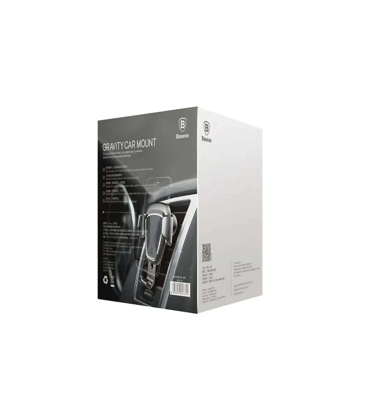 Gravitational Baseus phone holder, mounted on the car ventilation grid. The adjustment range of the holder is 360 degrees. Designed for phones from 63 to 88 cm wide. Automatic side clamps of the cradle automatically adjust to the width of the phone. The cut-out track allows you to connect the charger.