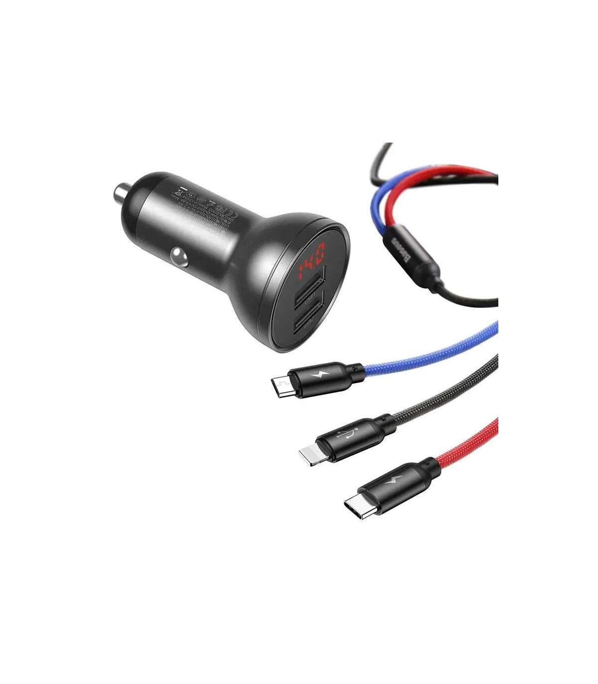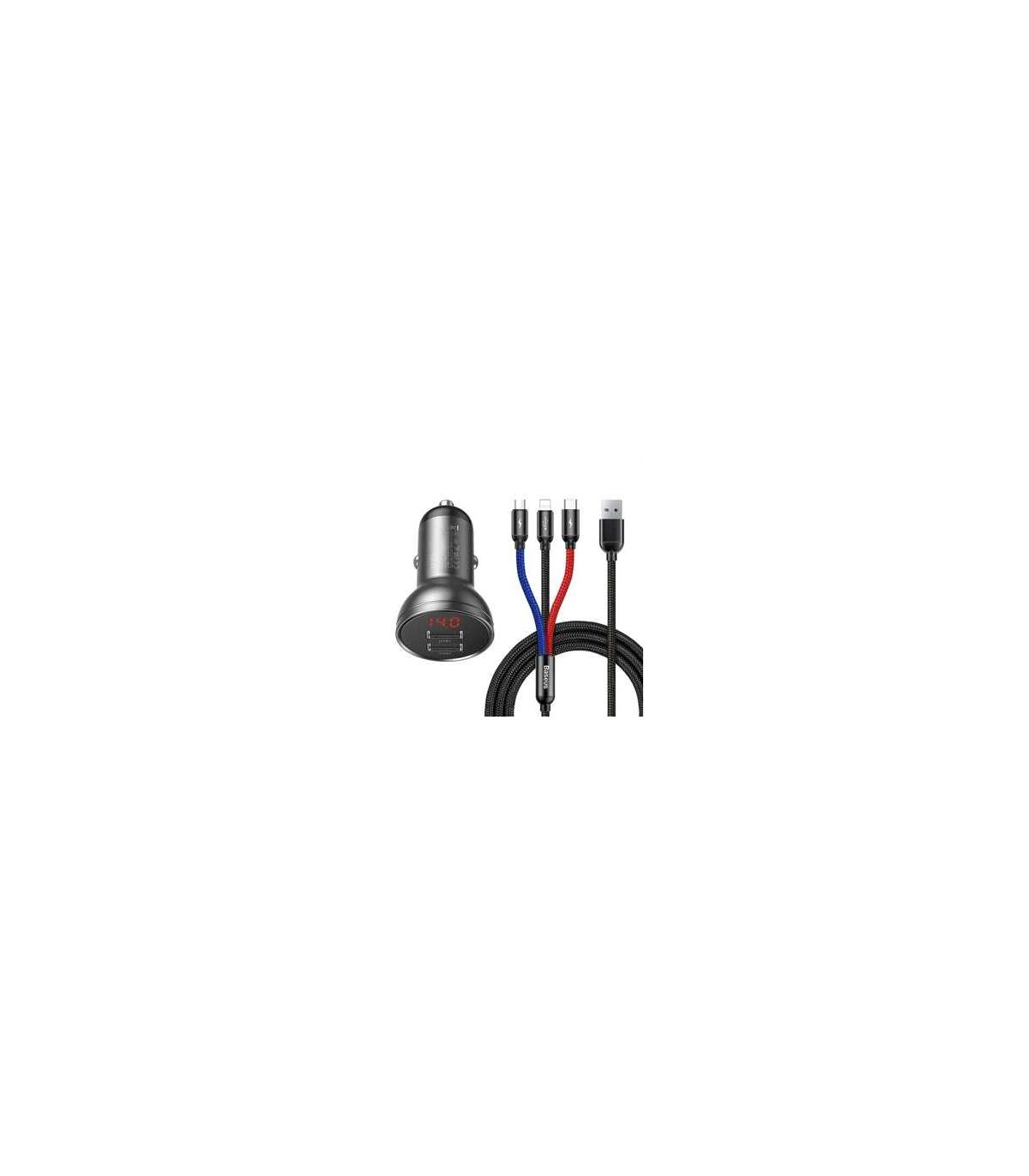 Ładowarka samochodowa Baseus z wyświetlaczem 24W + kabel USB 3w1 Baseus Three Primary Colors 1,2m