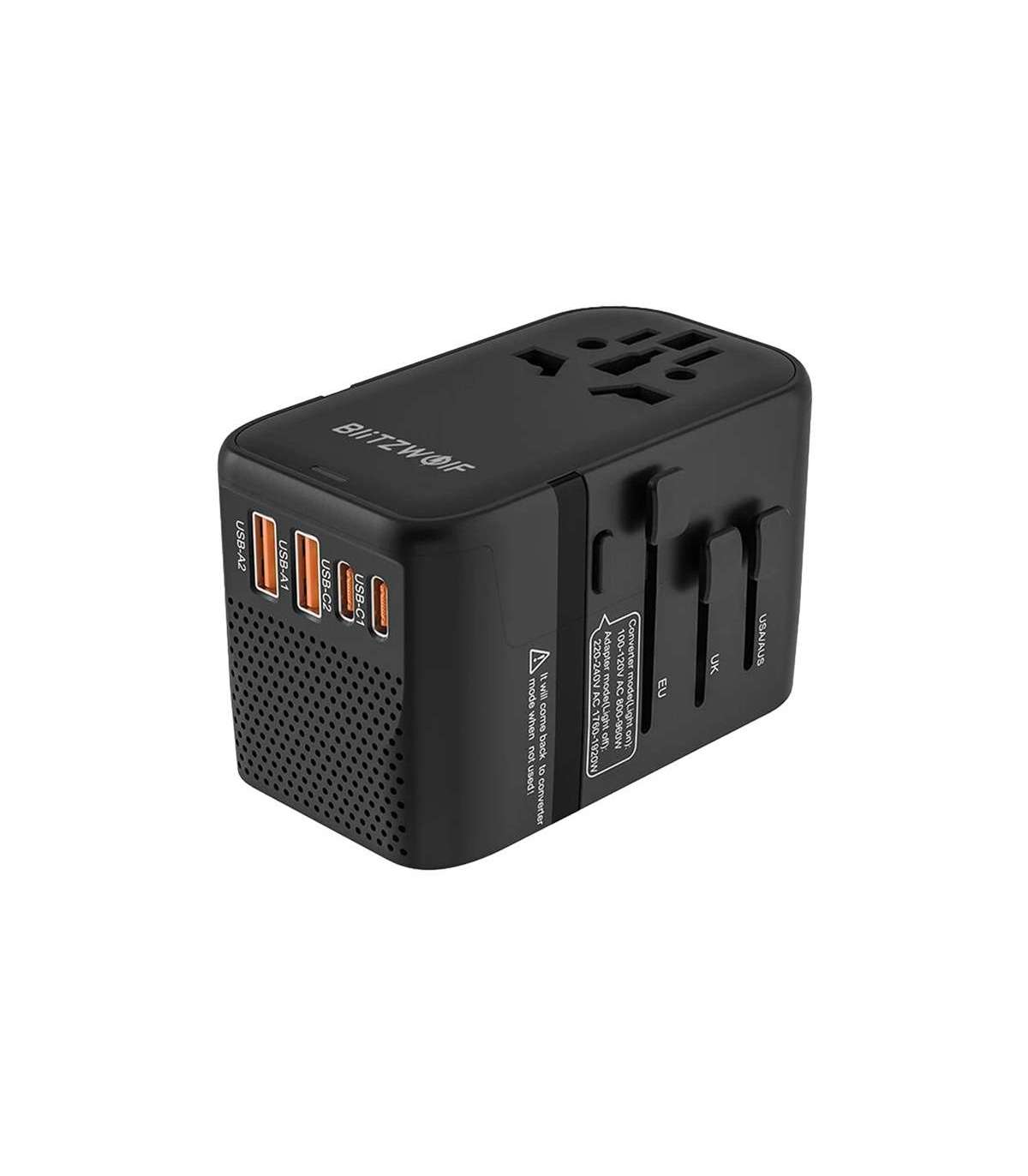 BlitzWolf® BW-TA3 is a practical travel adapter that will come in handy during trips to the USA, UK, EU countries, Australia, Canada and many other places around the world. With four interchangeable plug types and a built-in voltage converter (220V to 110V), the device allows you to safely connect equipment with different power standards. The adapter also has 4 USB ports (2x USB-C, 2x USB-A), which allow you to charge several devices at the same time, without the need to carry additional chargers.