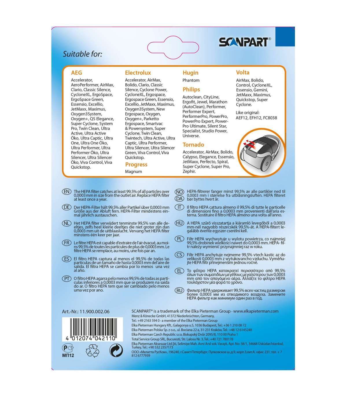 Like original HEPA filters AEG AEF12, Electrolux EFH12 & Philips FC8038.
