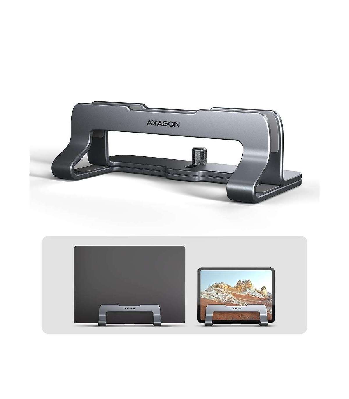 AXAGON STND-VG is an elegant and practical stand for a laptop or tablet that allows vertical placement of the device, helping to keep your workspace organized and free up more desk space. It is suitable for devices with a screen size from 10" to 17.3". The compact and easily portable design ensures convenient use at home, in the office or on the go. An advantage is the adjustable slot width from 9.5 mm to 25.5 mm, allowing easy insertion of most laptops. The set width is securely held by a knurled adjustment screw, which firmly locks the stand in the desired position. The base is made of aluminium castings guaranteeing long life and reliability. Thanks to the non-slip finish, you don't have to worry about unwanted movements – your device stays firmly in place without damaging the surface of the laptop or the pad. These carefully designed features ensure perfect stability for your laptop giving you peace of mind and comfort during everyday use. The compact size of the stand allows easy carrying wherever you need it. Its elegant grey design not only complements your desk in style, but also brings practical features you'll appreciate in everyday use. The vertical stand provides more space around the notebook’s ventilation openings, ensuring more efficient heat dissipation and helping maintain stable performance as well as a longer device lifespan. At the same time, it keeps the keyboard cleaner and protects the laptop from dust and accidental spills, as the device is raised above the desk surface.