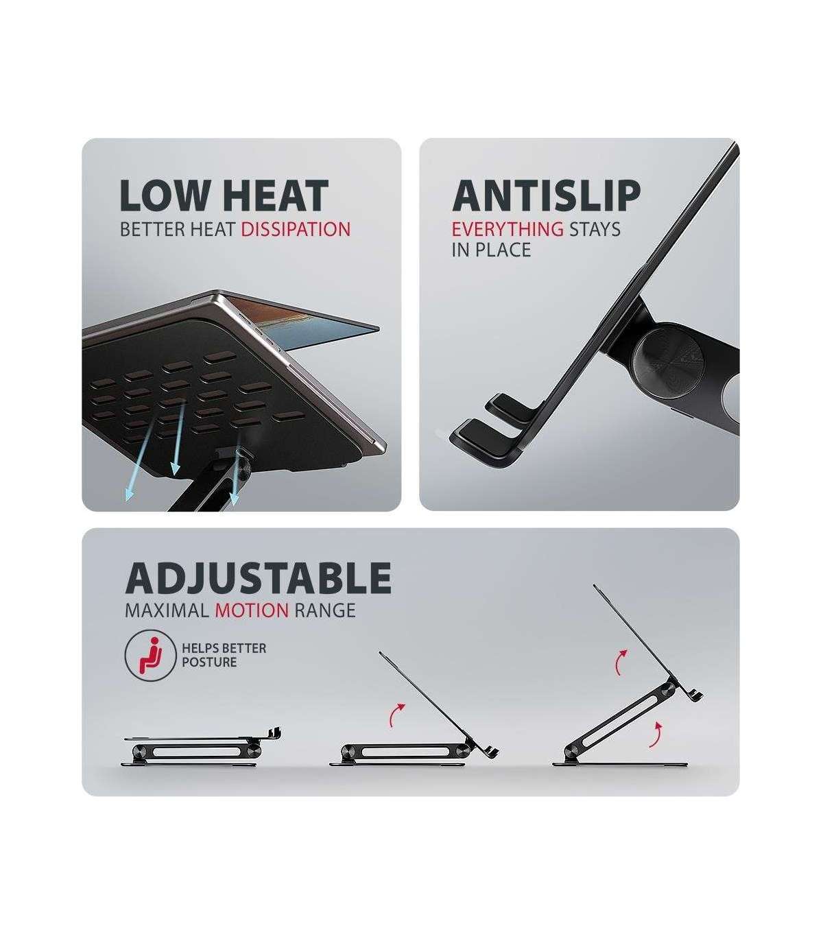 Aluminum HQ stand for laptops size 10"–17.3". Adjustable height and angle. Black version.