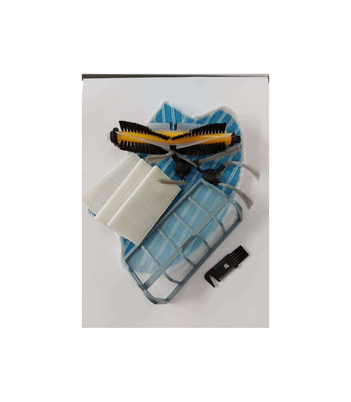 The set includes 1 pair of side brushes, 1 middle brush, 3 mop cloths, 3 hepafilters, 1 cleaning device