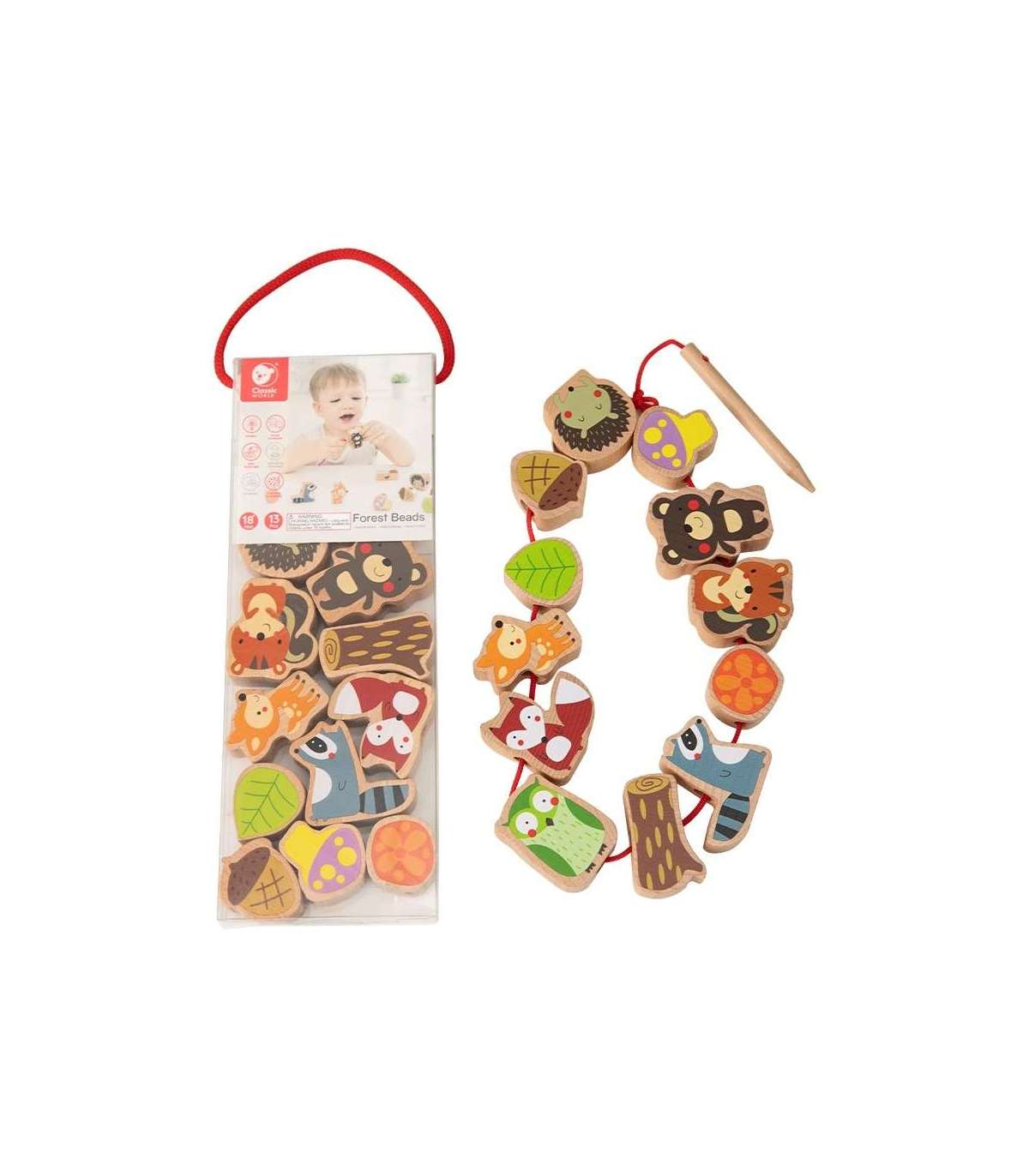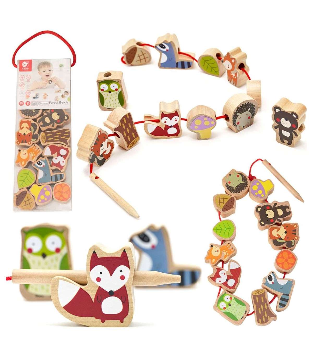 Classic World Бусины для нанизывания — Лесные животные — идеальная игрушка для развития моторики ребёнка. Игрушка-шнуровка для детей выполнена в теме мира лесных животных. Игрушка-шнуровка от Classic World — это классический набор деревянных элементов с отверстиями, через которые ребёнок продевает шнурок. Это отличная игра, которая развивает ловкость и пробуждает интерес ребёнка к животным, живущим в лесу.