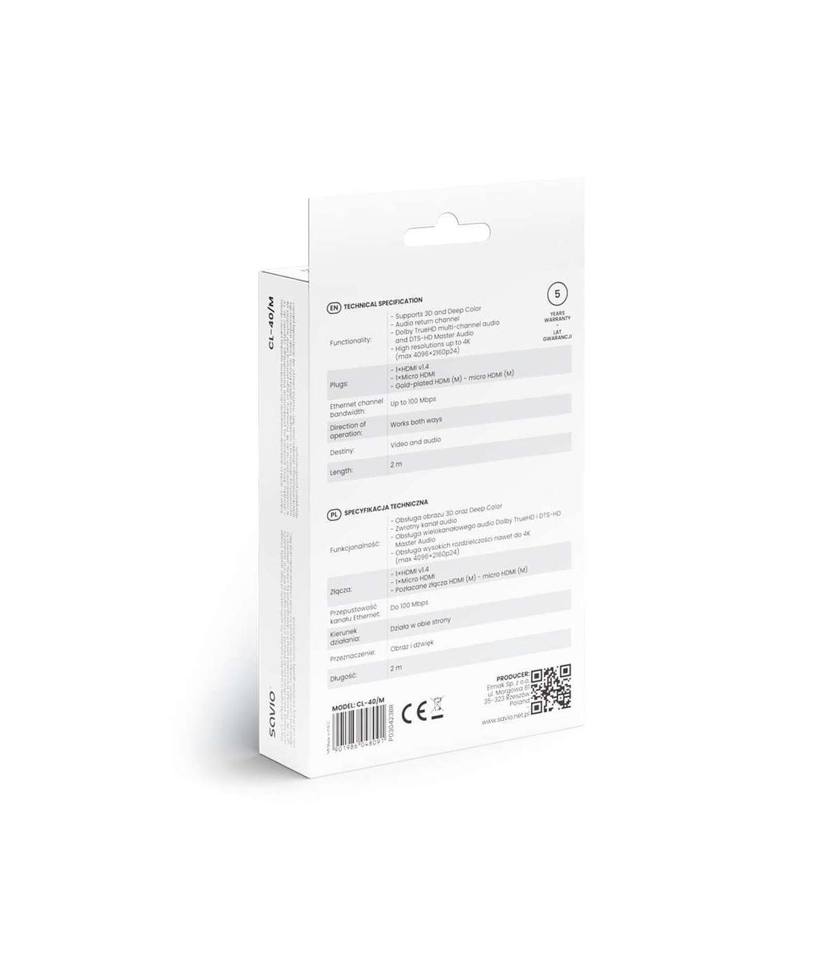 Savio CL-40/M HDMI (M) - micro HDMI (M) cable with Ethernet, 2m, Black