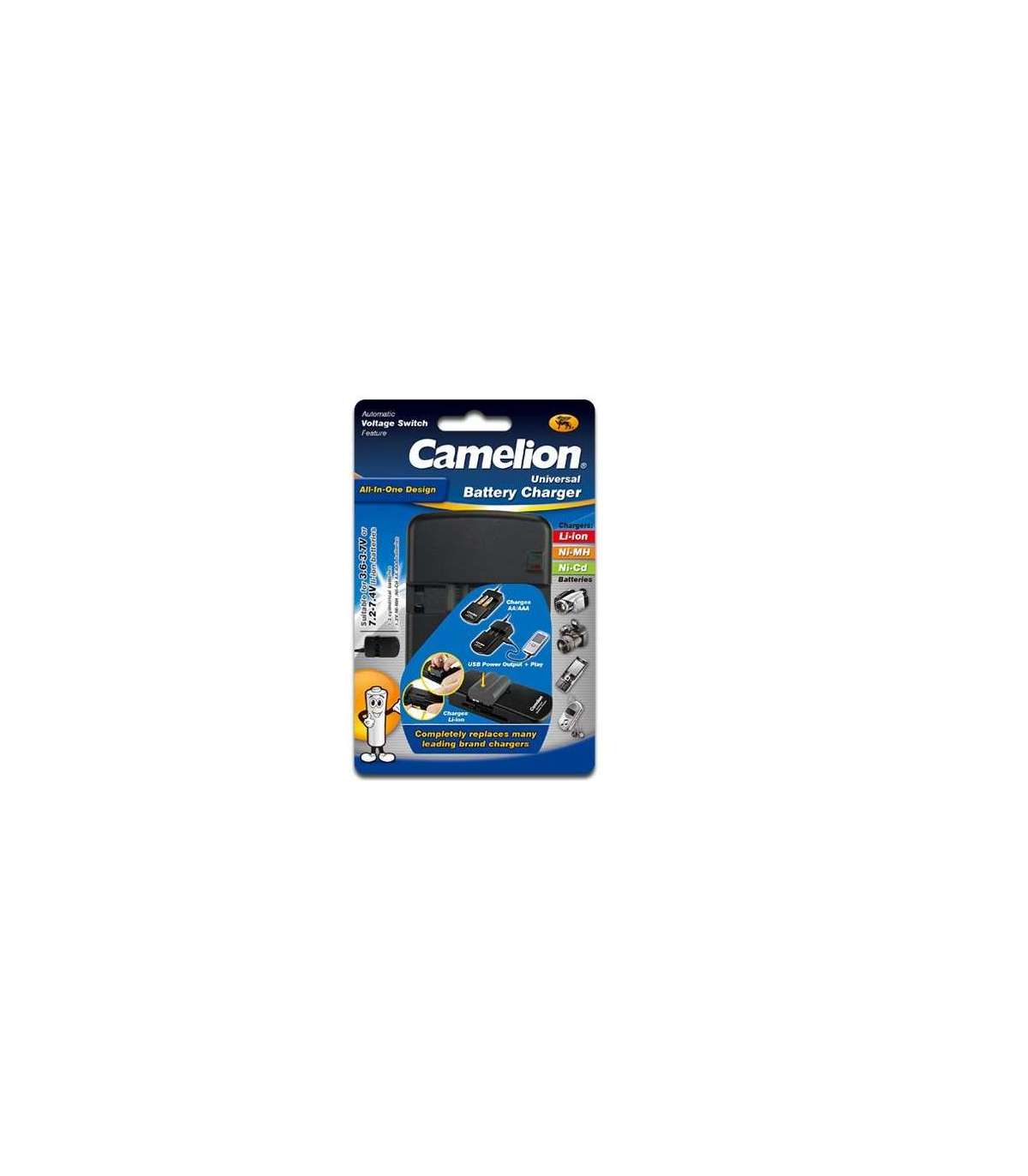 • Toetab paljusid seadmeid, mis ühilduvad 3,7 V ja 7,4 V Li-Ion, 1,2 V Ni-MH ja Ni-Cd akudega - selliste seadmete jaoks nagu digikaamerad, videokaamerad, mobiiltelefonid, MP3/MP4-mängijad, mängukonsoolid jne
