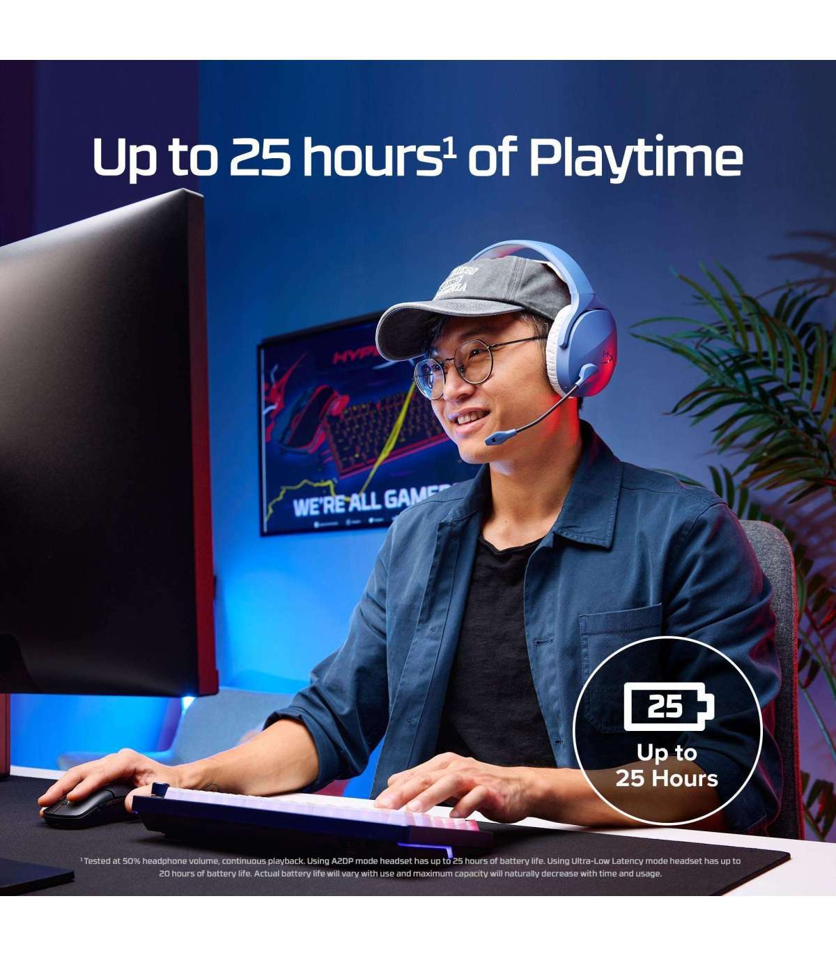 [1] Tested at 50% headphone volume, continuous playback. Using an A2DP mode headset has up to 25 hours of battery life. Using Ultra-Low Latency mode headset has up to 20 hours of battery life. Actual battery life will vary with use and maximum capacity will naturally decrease with time and usage.
