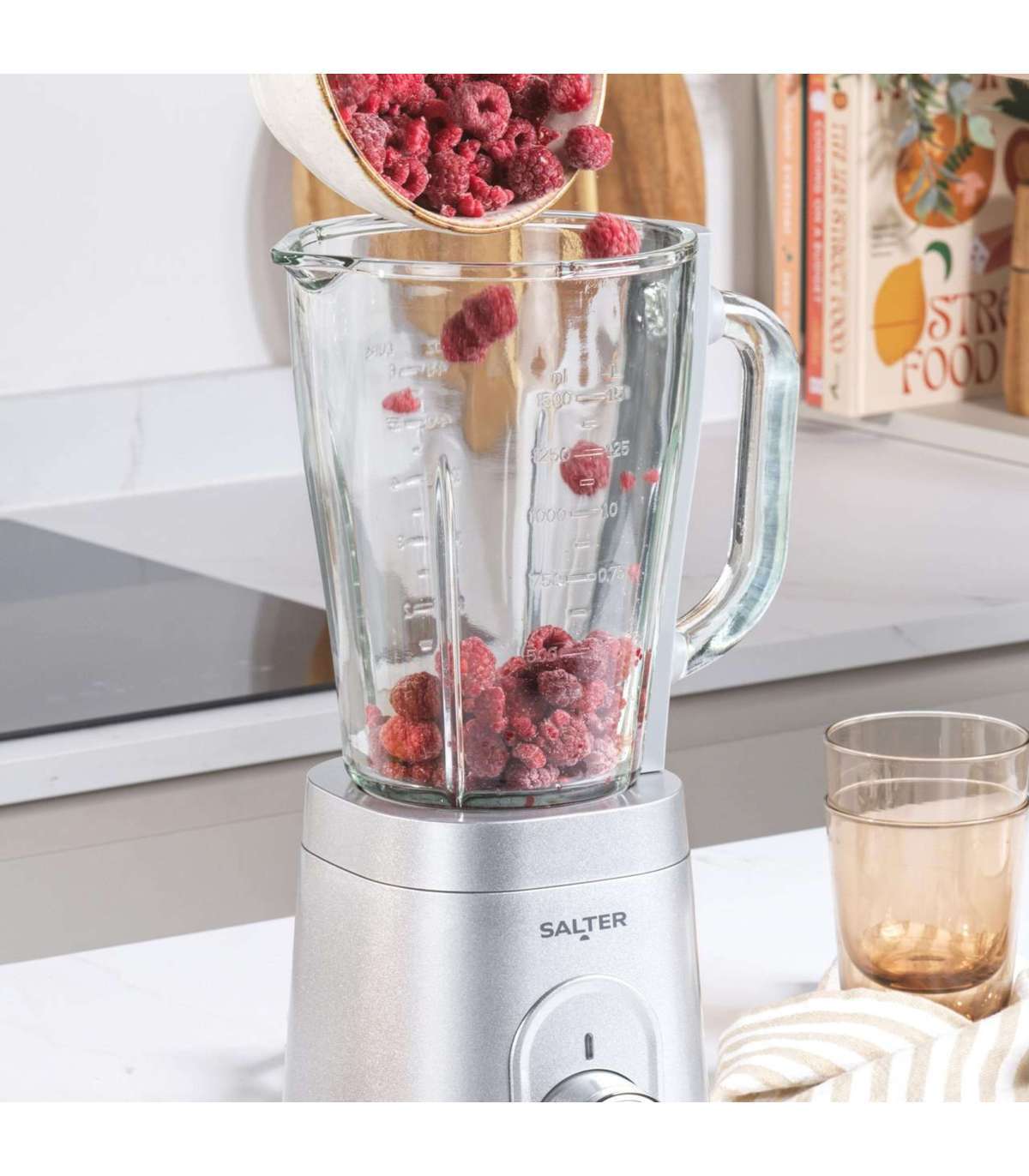 1,5-liitrine klaaskann: valmistage Salter Aspeni klaaskannmikseriga suurtes kogustes tervislikke smuutisid, mahlu ja kastmeid.