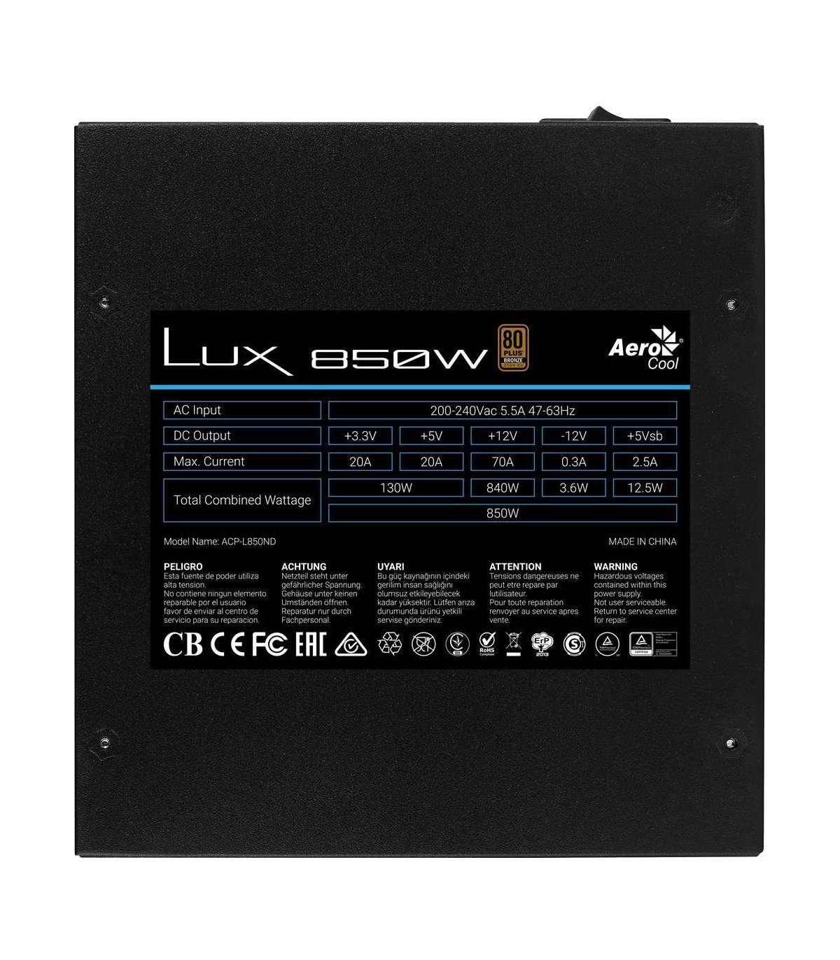 Aerocool LUX850 PC Power Supply 850W 80 Plus Bronze 230V 88% Efficiency Black
