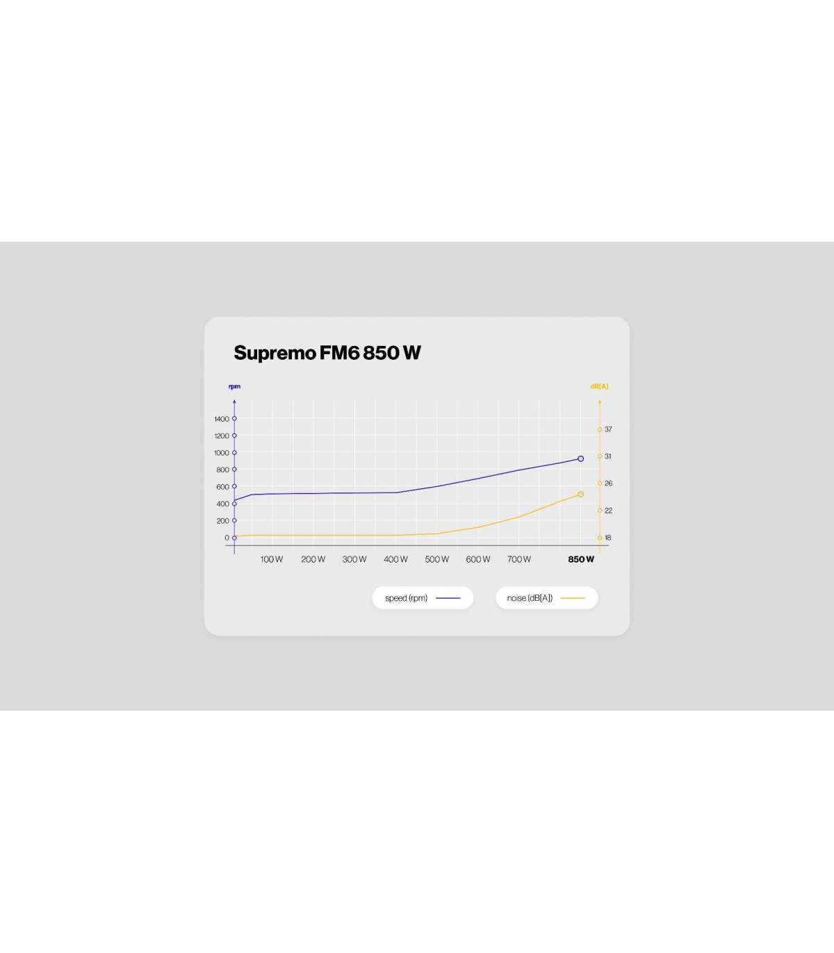 Supremo FM6 850 W has been designed with maximum user comfort in mind. Thanks to the optimized component setup streamlining the air flow and a high-performance cooling system, the PSU runs exceptionally quietly and retains low temperature even under full load.
