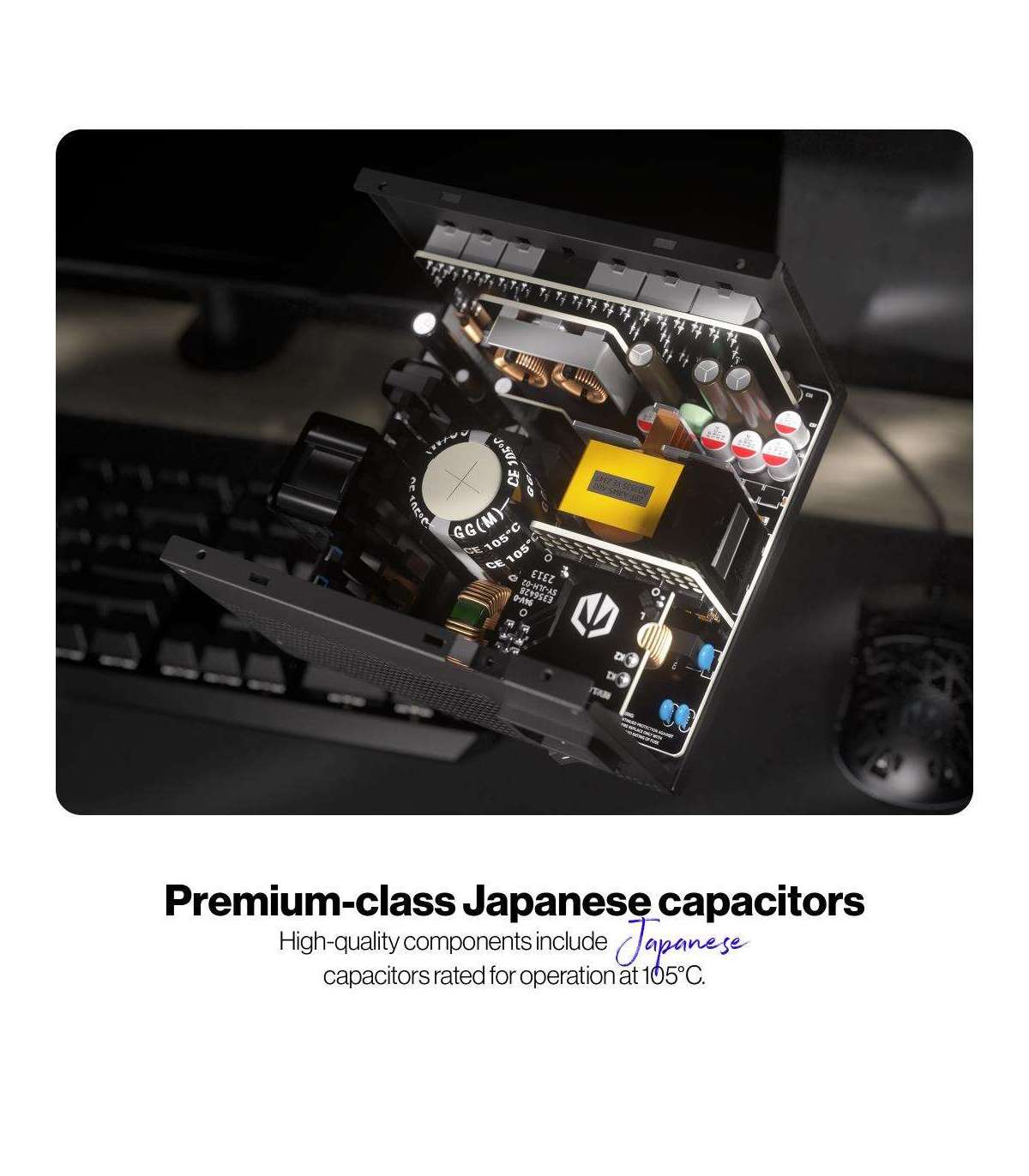 All capacitors installed in the Supremo FM6 850 W power supply unit are reliable, premium-class components made in Japan. They retain their operating parameters even at high temperatures (105 °C), enabling them to perform faultlessly and stably for years to come, even under extremely demanding operating conditions.