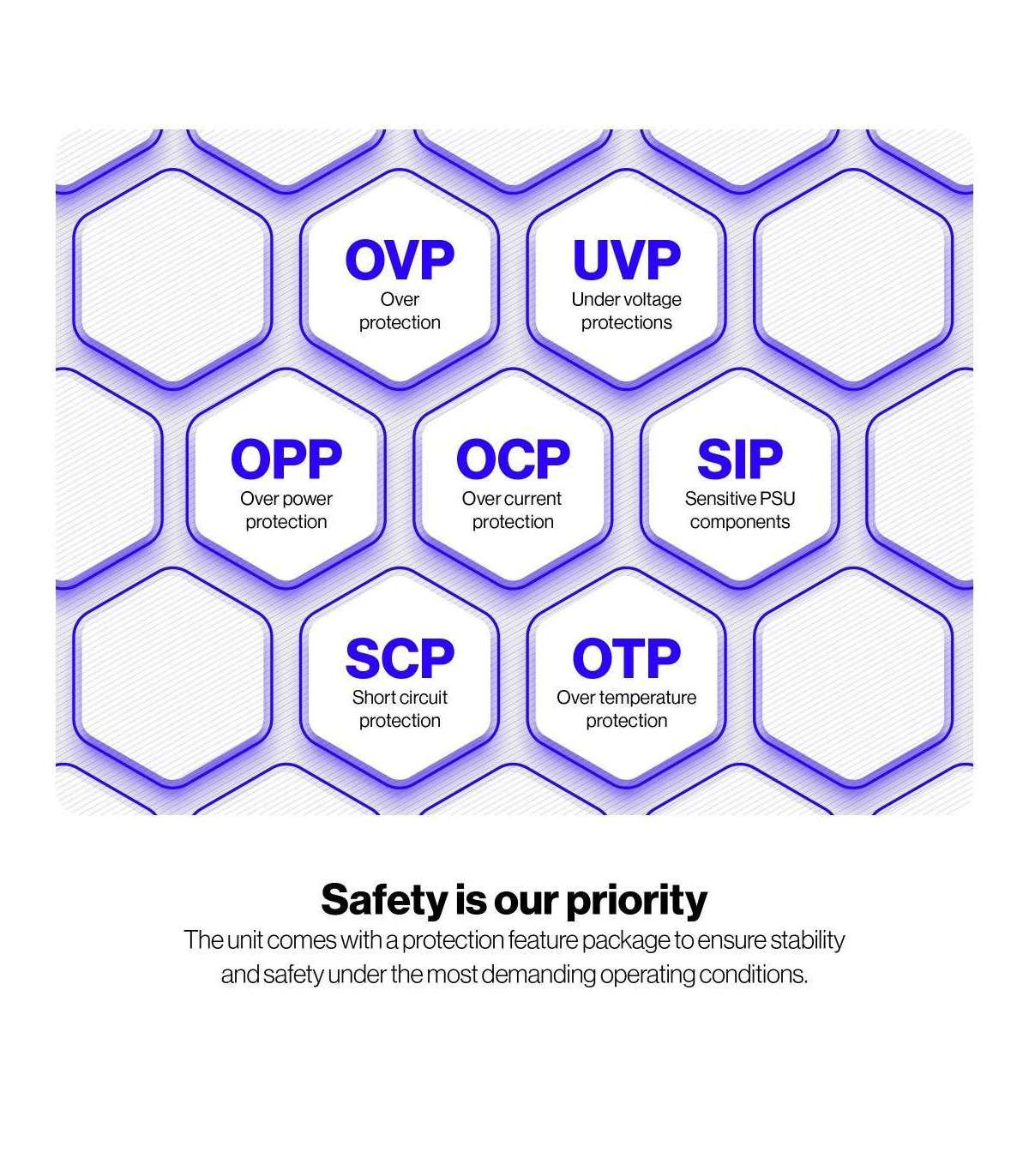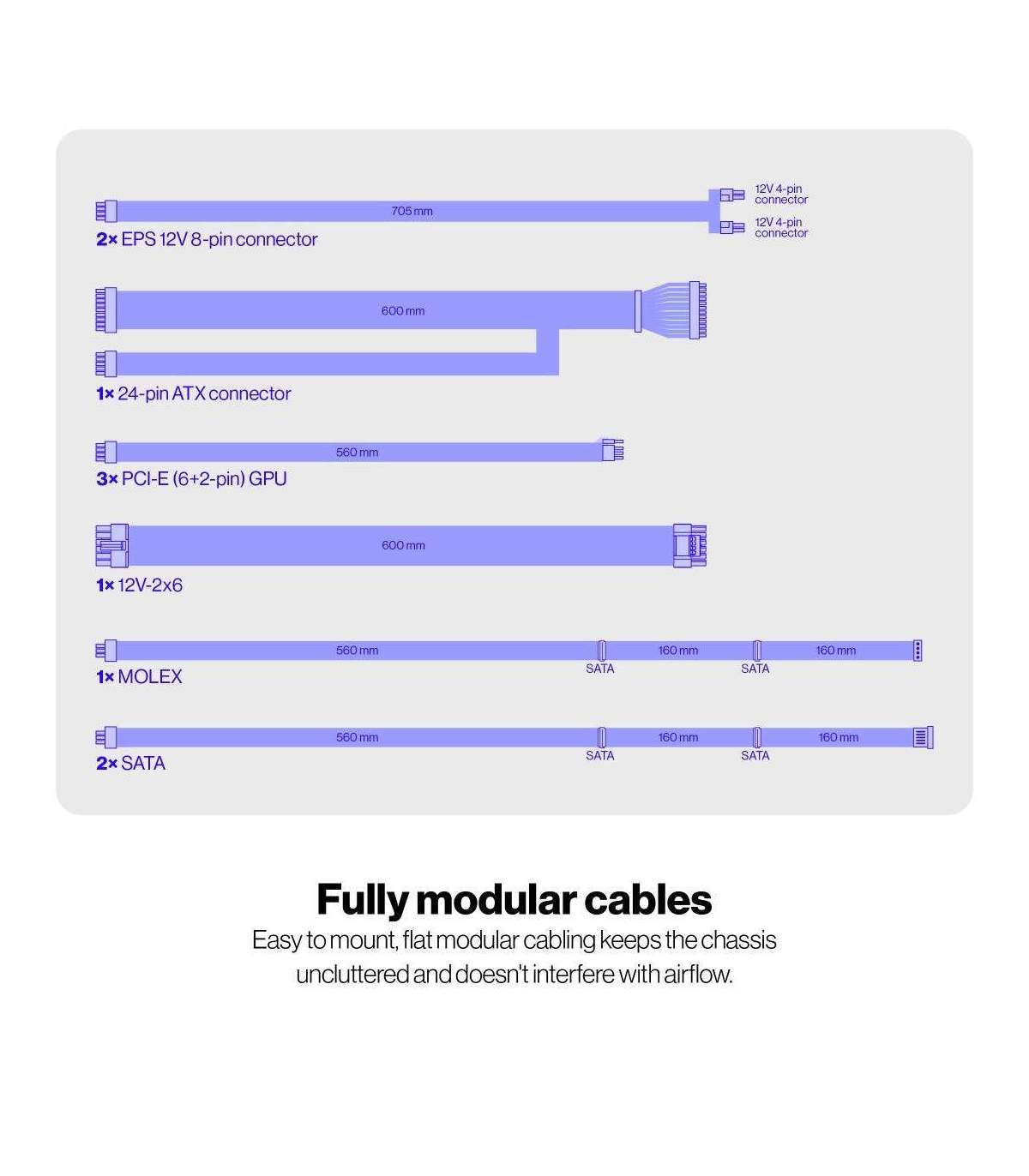 The quiet Fluctus 120 mm fan and optimized component placement ensure low temperatures with almost noiseless operation. Additionally, the modular cables make it easier to keep the surrounding space in order. The PSU also has a security package that protects it from overloading and power surges. Its quality is additionally confirmed by a 10-year warranty.