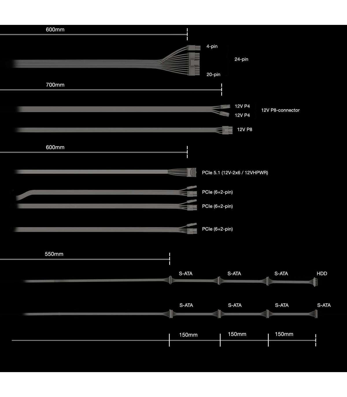 Power Zone 2 850W is an ATX 3.1 PSU and comes with both native integration of the 12V-2x6 connector for next-generation PCIe 5.1 graphics cards, and 3 PCIe 6+2-pin connectors for support of current-gen GPUs. A 90° angled 12V-2x6 connector in the scope of delivery leaves no doubt that this PSU is here to stay. All of this makes Power Zone 2 850W extremely versatile and the perfect choice for powerful systems of today and the ones to come.