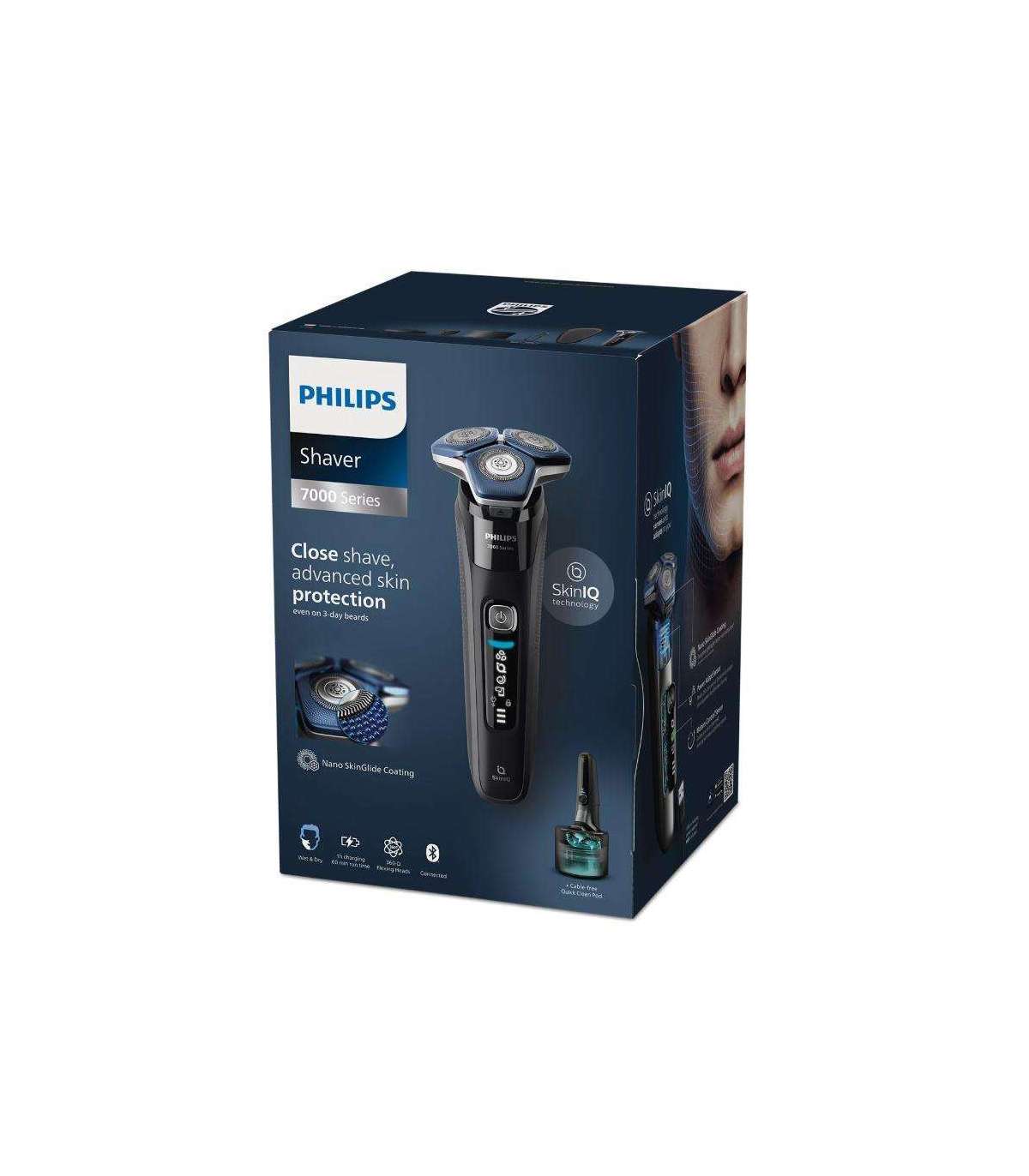 The Philips Series 7000 shaver glides smoothly over your skin, cutting every hair with the skin – even on 3-day beards. Equipped with advanced SkinIQ technology, the shaver detects hairs, adapts and guides you through the right movements to provide better skin protection.