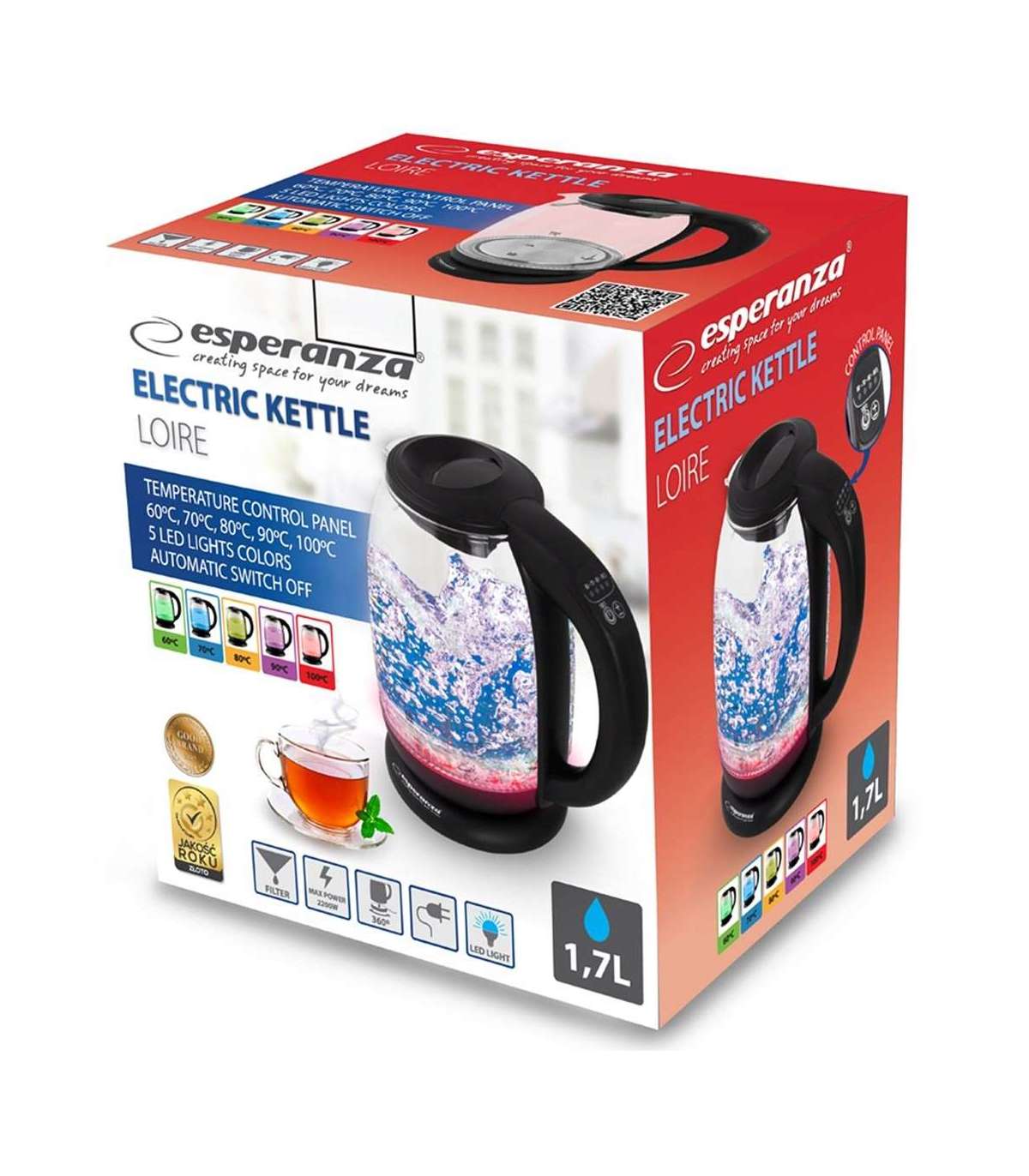 Esperanza EKK027 electric kettle 1.7 L 2200 W Black, Transparent