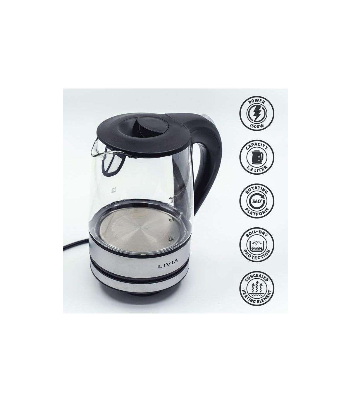 Stylish kettle with durable glass can and comfortable handle.
