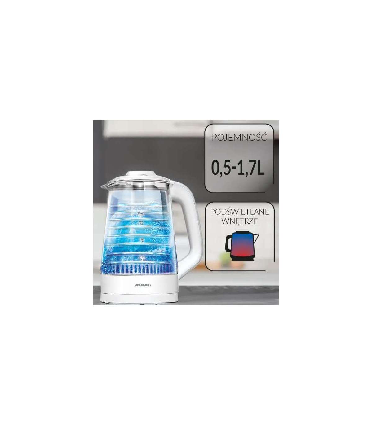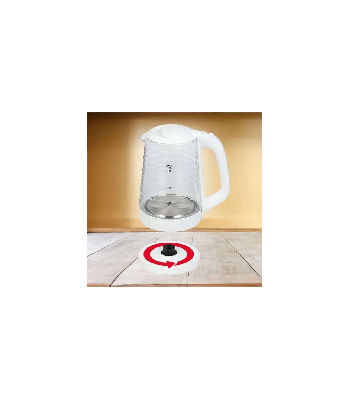 Мощность макс. 1,7 литра   Кувшин, вращающийся на 360 градусов.   Кувшин из боросиликатного стекла, прочный и устойчивый к пятнам.   Синий светодиод.   Нагревательный элемент с покрытием из нержавеющей стали.   Защита от высыхания.   Автоматически отключается, когда вода закипает.   Мощность: 220-240 В, 50/60 Гц, 1850-2200 Вт