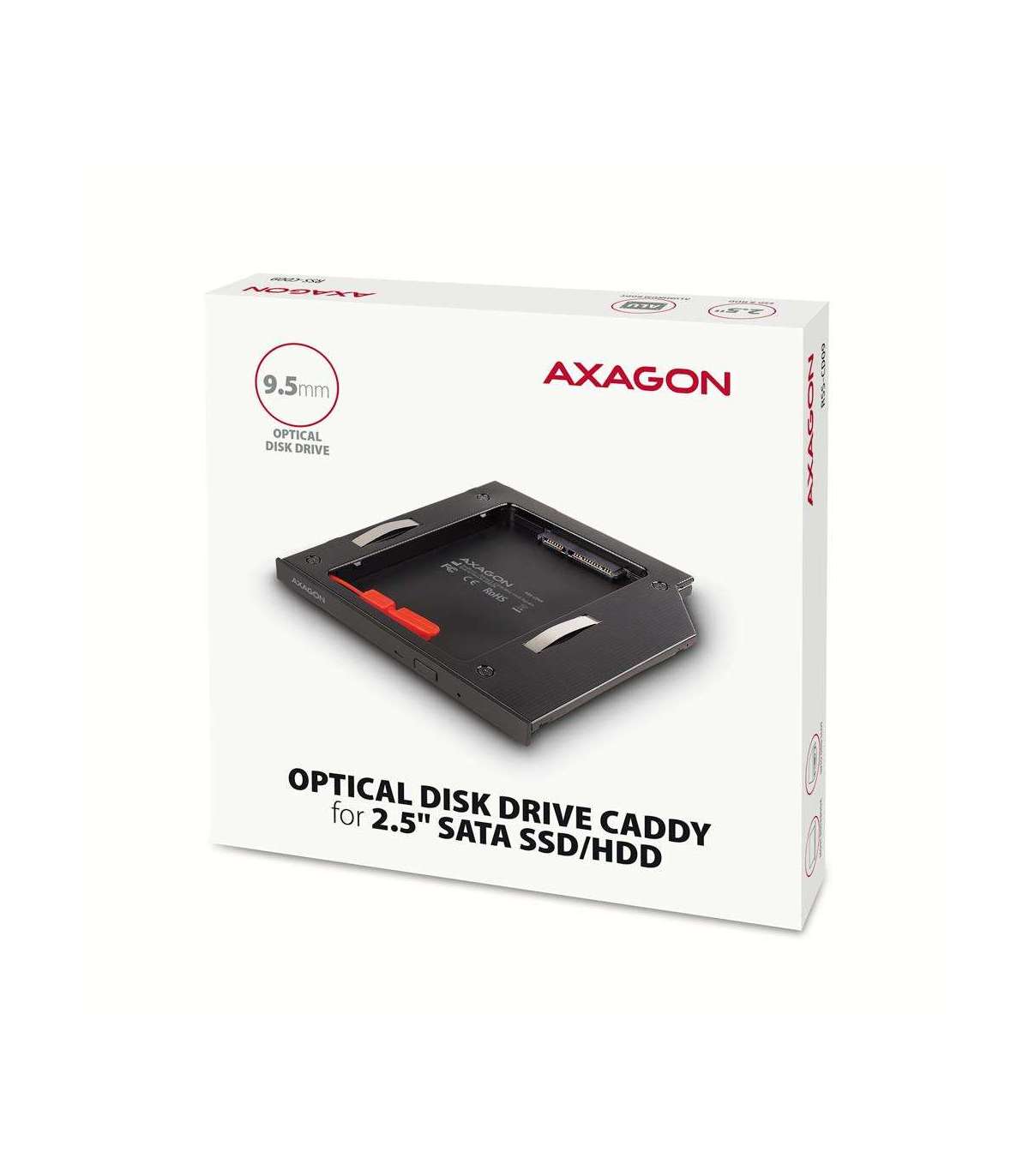 The AXAGON RSS-CD09 internal frame is designed to be mounted instead of the existing 9.5 mm CD/DVD drive. It is designed for 2.5" SSD/HDD SATA drives. You can easily replace the optical drive in your laptop with a hard drive.