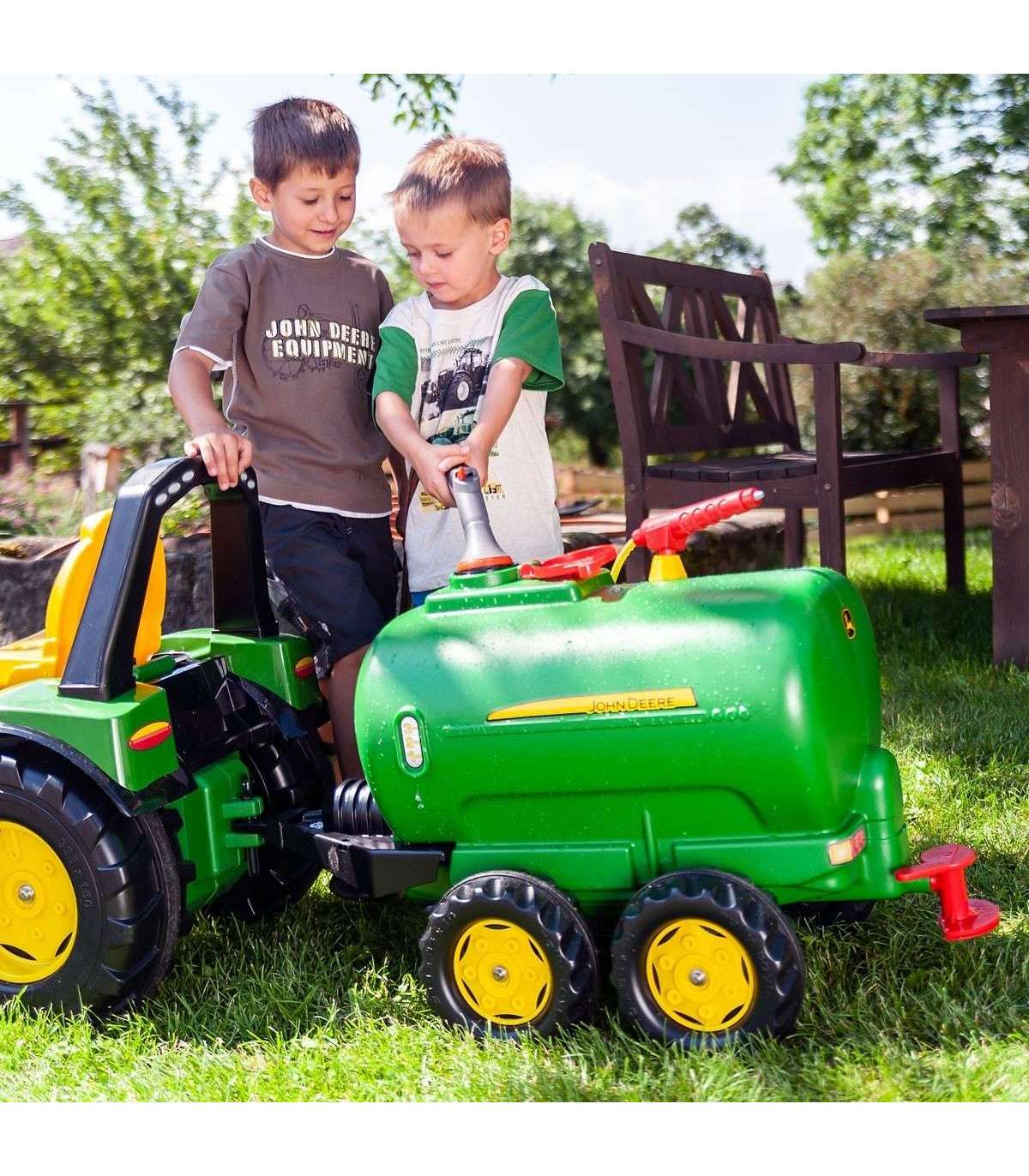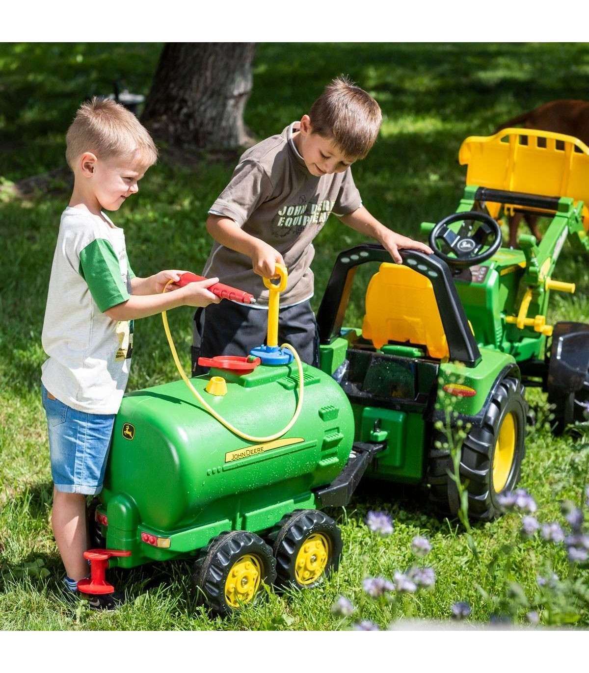 Цистерну можно наполнить водой, а затем поливать сад или подъезд с помощью насадки или распылителя, создавая необходимое давление ручным насосом. Этот прицеп подходит ко всем тракторам ROLLY TOYS. Это двухосная цистерна по лицензии John Deere, которую можно заполнить водой, а затем распылять с помощью распылителя и насоса.