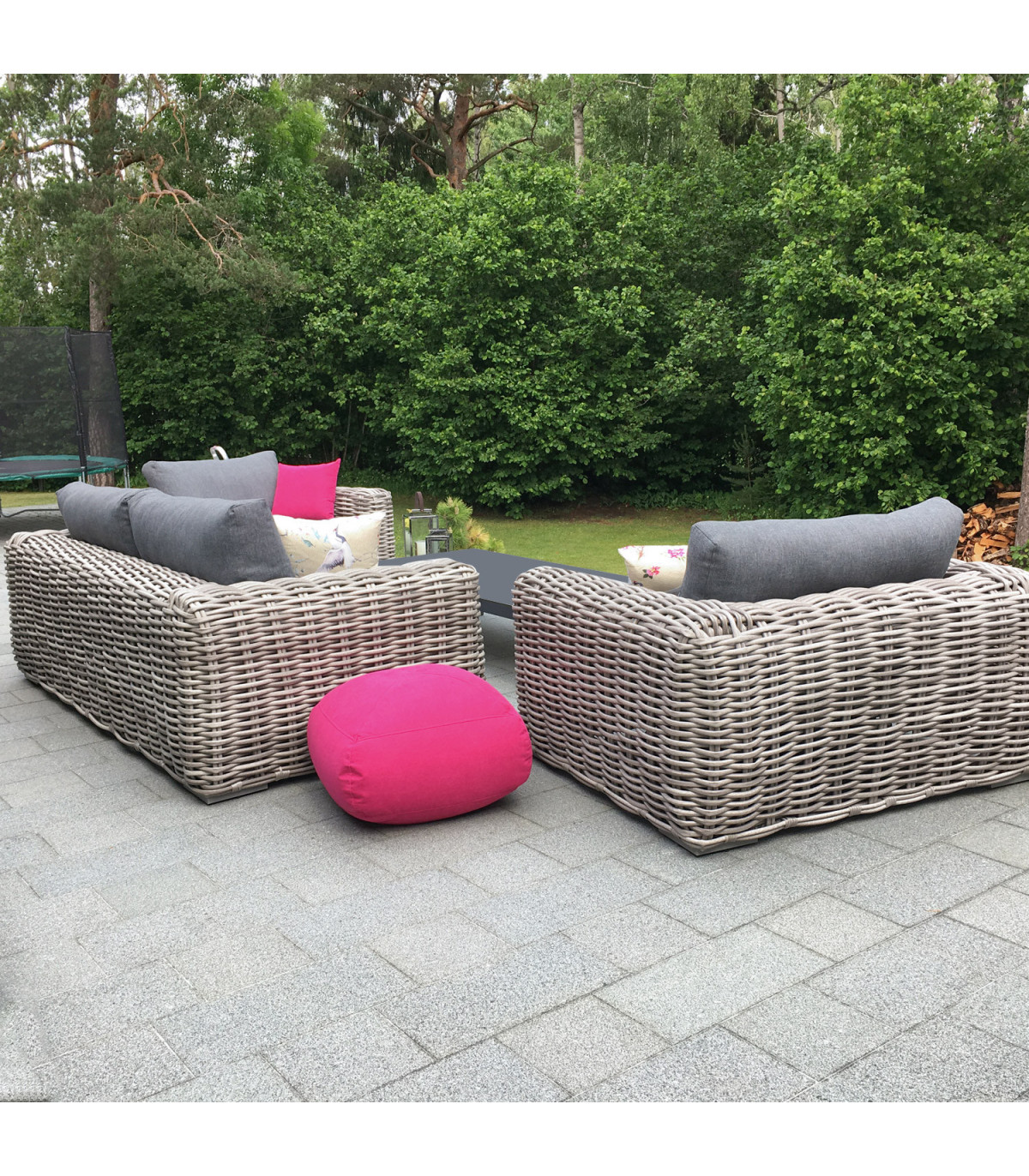 Комплект садовой мебели CALISTA стол, диван и 2 стула. Алюминиевые рамы дивана и кресел покрыты эффектным пластиковым плетением. Размеры стола 160x80xH36см, столешница: закаленное стекло толщиной 5 мм, окрашенное в серый цвет. Ножки и каркас стола изготовлены из алюминия и покрыты порошковой краской серого цвета. Размеры дивана 220x112xH67см, а размеры кресла 137x112xH67см. Подушки включены. Чехлы на подушки изготовлены из полиэстера серого цвета. Толщина подушек сиденья 16см. Изделие устойчиво к переменчивым погодным условиям и очень простое в уходе, только подушки нуждаются в защите от непогоды. Чтобы продлить срок службы садовой мебели, мы рекомендуем использовать чехлы для садовой мебели. ХРАНЕНИЕ: в конце летнего сезона мы рекомендуем хранить садовую мебель в помещении. Очистите и высушите мебель перед хранением. Для хранения используйте сухое, хорошо проветриваемое помещение.