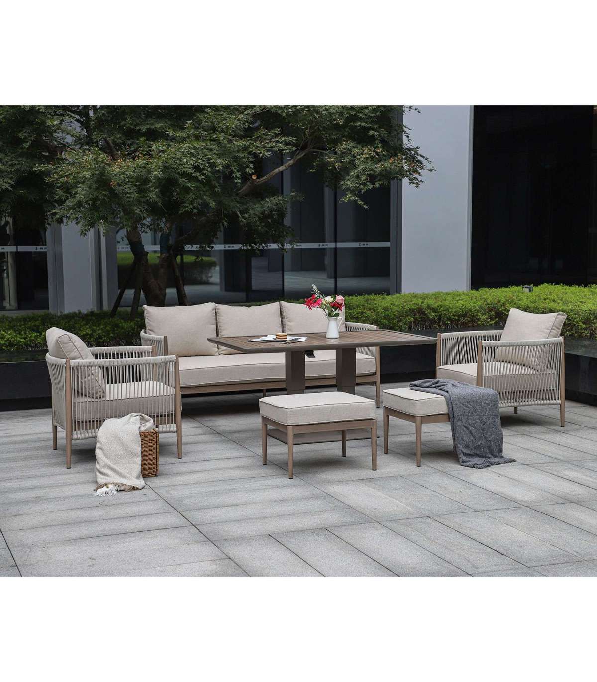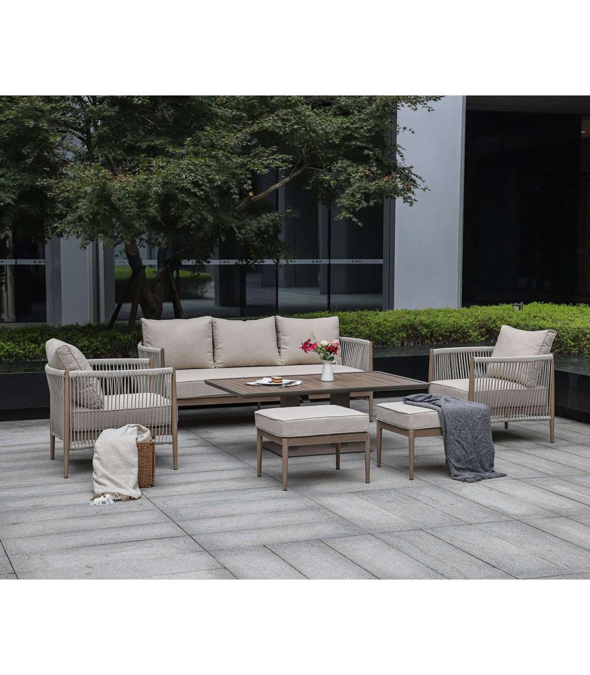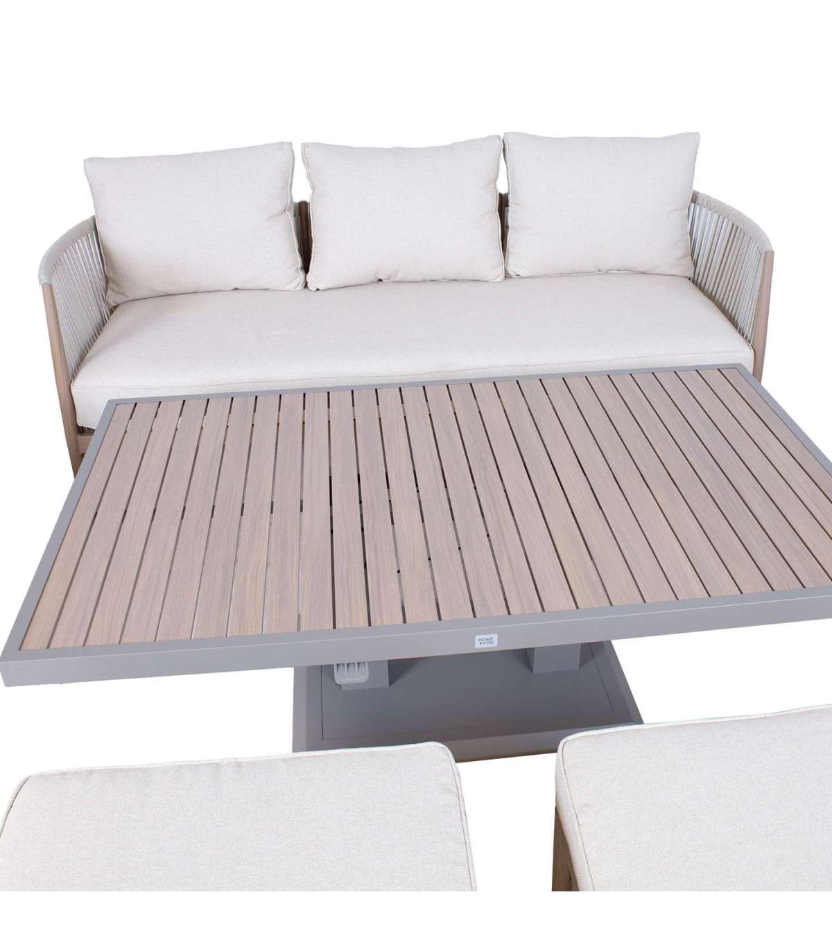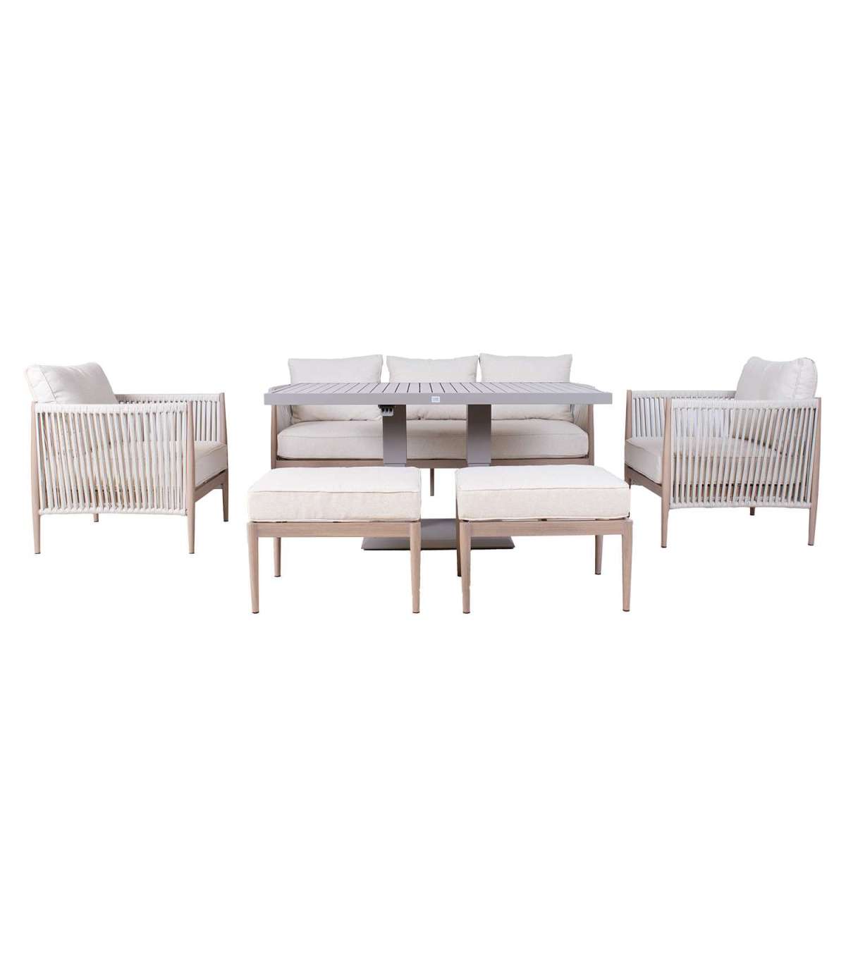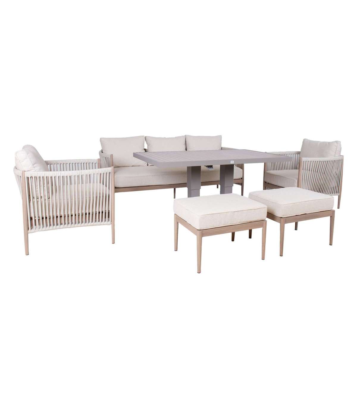 Aiamööblikomplekt MEDINA muudetava kõrgusega laud, 3-kohaline diivan, 2 tugitooli ja 2 tumbat, beež.