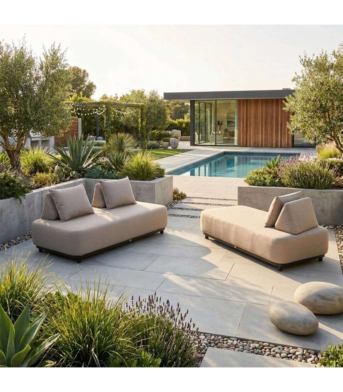 Kangaga kaetud polsterdatud istmega õuediivan mõjub uuenduslikult ja üllatab oma nutika disaini ja funktsionaalsusega.