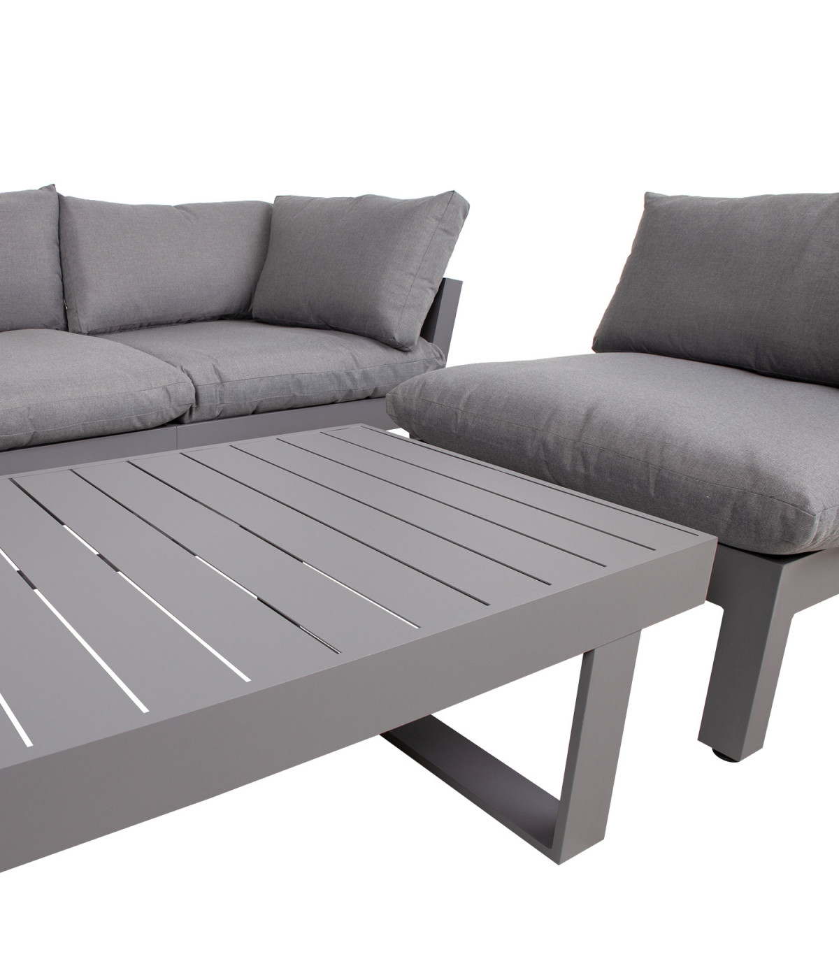 Комплект садовой мебели FLUFFY модульный диван и стол, серый. Журнальный столик 133x73,5xH42см, столешница и рама: серый алюминий. В комплект входят 2 угловых модуля (13792) 93x93xH66см и 3 средних модуля без подлокотника (13793) 82x93xH66см. Модули дивана изготовлены из алюминия и покрыты темно-серой порошковой краской. Подушки включены. Ткань подушки: темно-серая полиэфирная ткань. Модули дивана можно размещать по-разному или использовать как отдельные сидения.