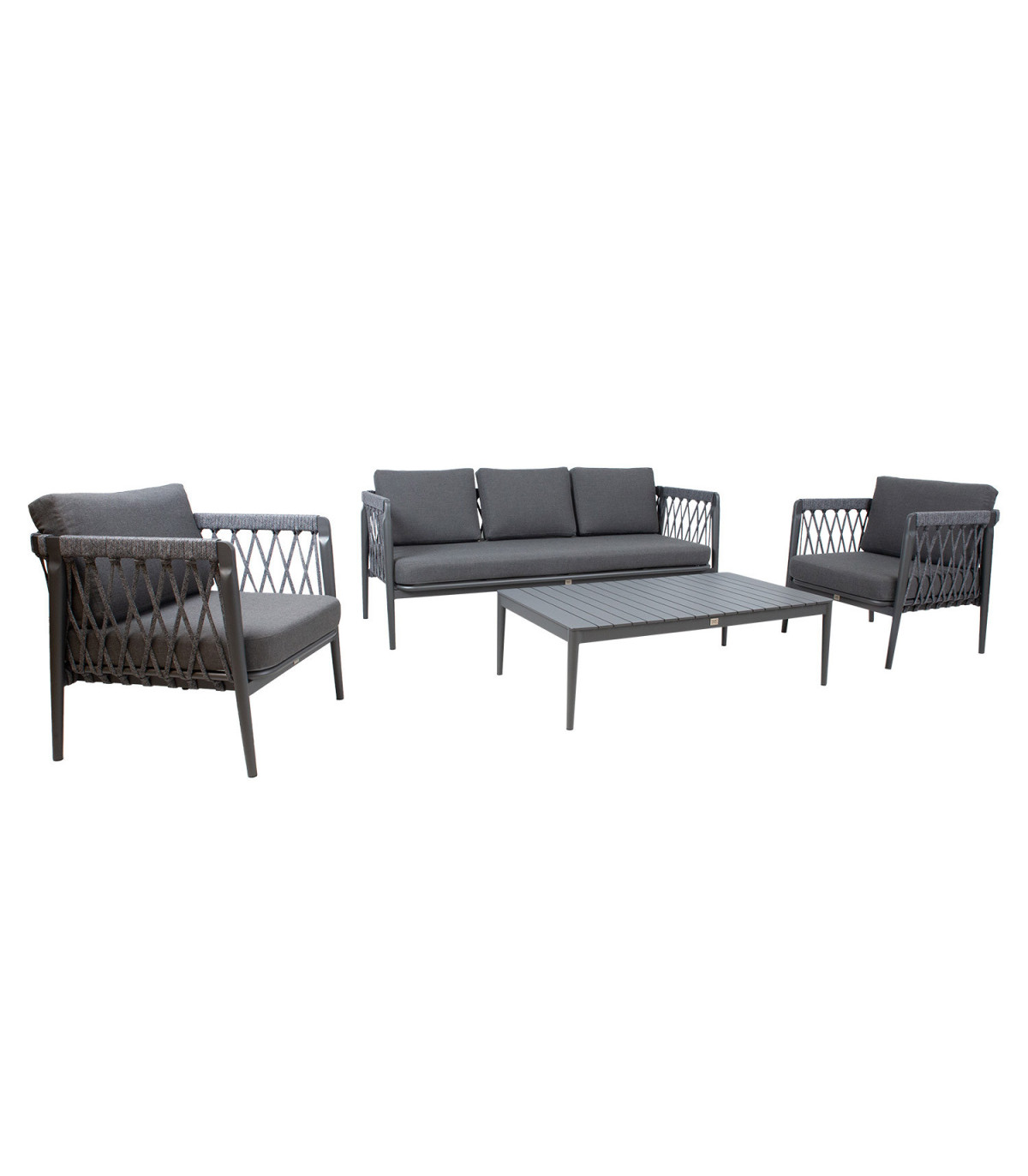 Комплект садовой мебели ANTHEM стол, диван и 2 стула, серый. Диван и стулья: серый алюминиевый каркас с однотонным плетением веревок. Подушки сиденья включены. Материал покрытия: серая акриловая ткань. Столешница и рама изготовлены из алюминия. Размеры: 3-местный диван 187x75xH78см, кресло 78x75xH78см, стол 120x70xH37см. Продукт долговечен в меняющихся погодных условиях и очень прост в уходе. Чтобы продлить срок службы уличной мебели, мы рекомендуем использовать чехлы для уличной мебели. ХРАНЕНИЕ: в конце летнего сезона рекомендуем хранить садовую мебель в помещении. Очистите и высушите мебель перед хранением. Используйте для хранения прохладное, сухое, хорошо проветриваемое помещение.