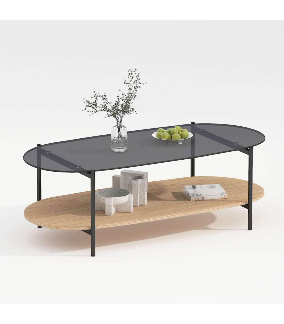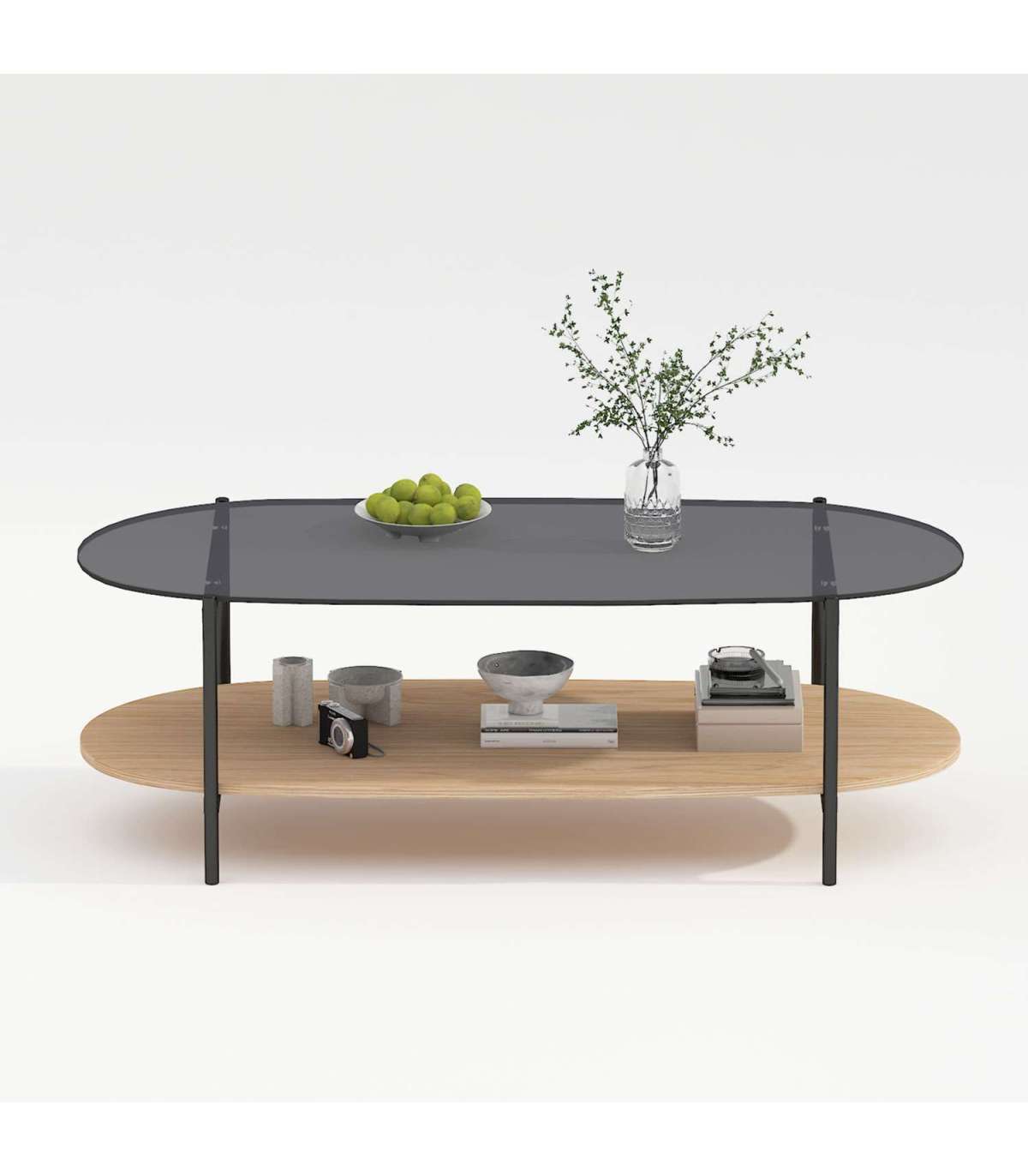Lauaplaat: hall karastatud klaas. Alumine riiul: hele tammedekooriga melamiinplaat.