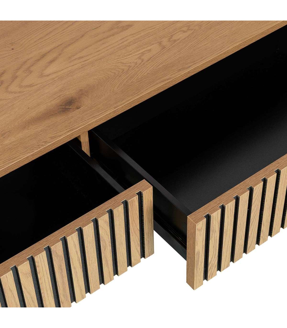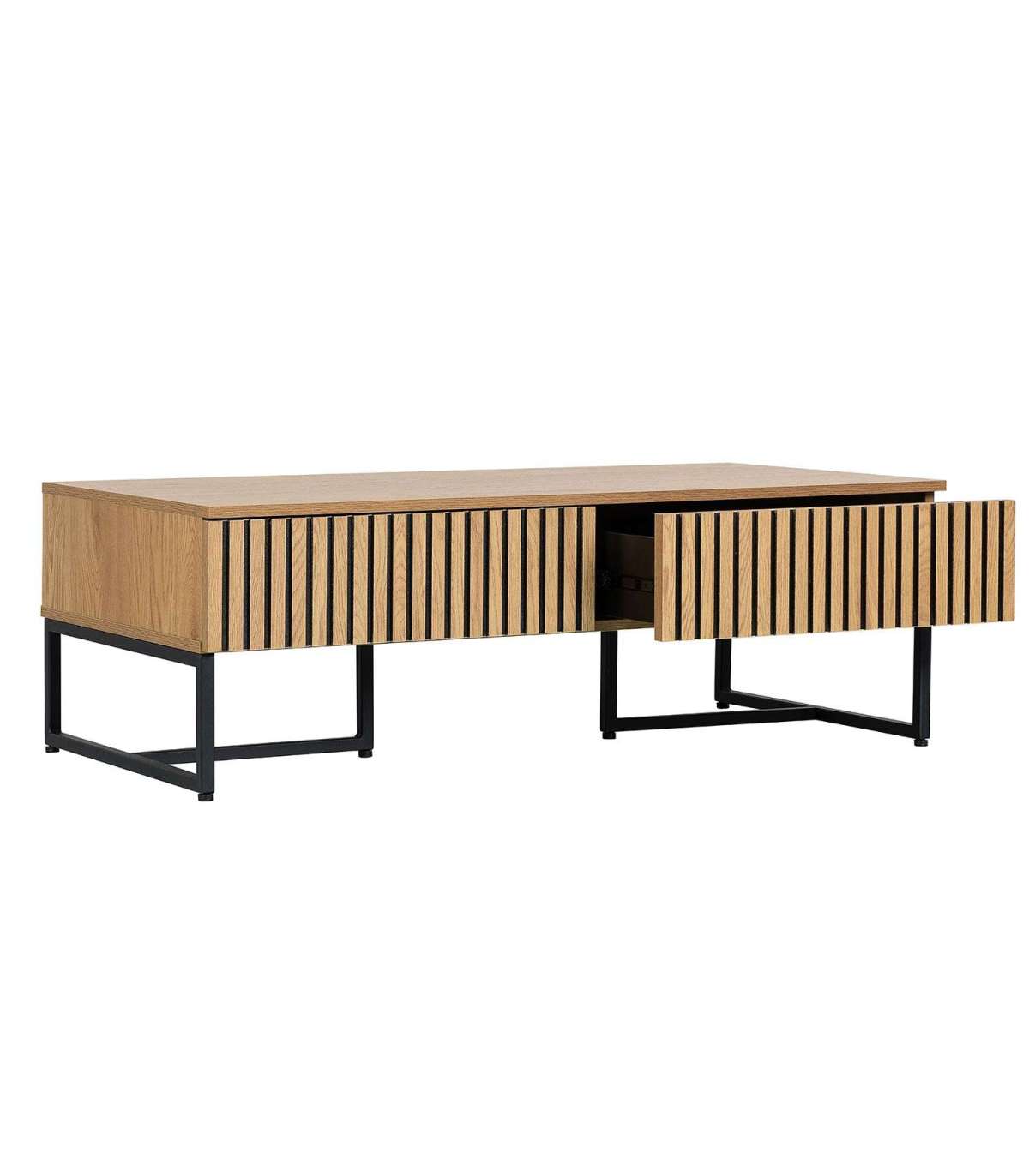 Diivanilaud HAMPTON 2-sahtliga 120x60xH40cm. Laud on valmistatud tammedekooriga melamiinplaadist. Sahtlite esipaneele kaunistavad kitsad tammevärvi MDF liistud mustal taustal. Sahtlid liiguvad metallsiinidel. Laua metallist alusraam on viimistletud musta pulbervärviga.