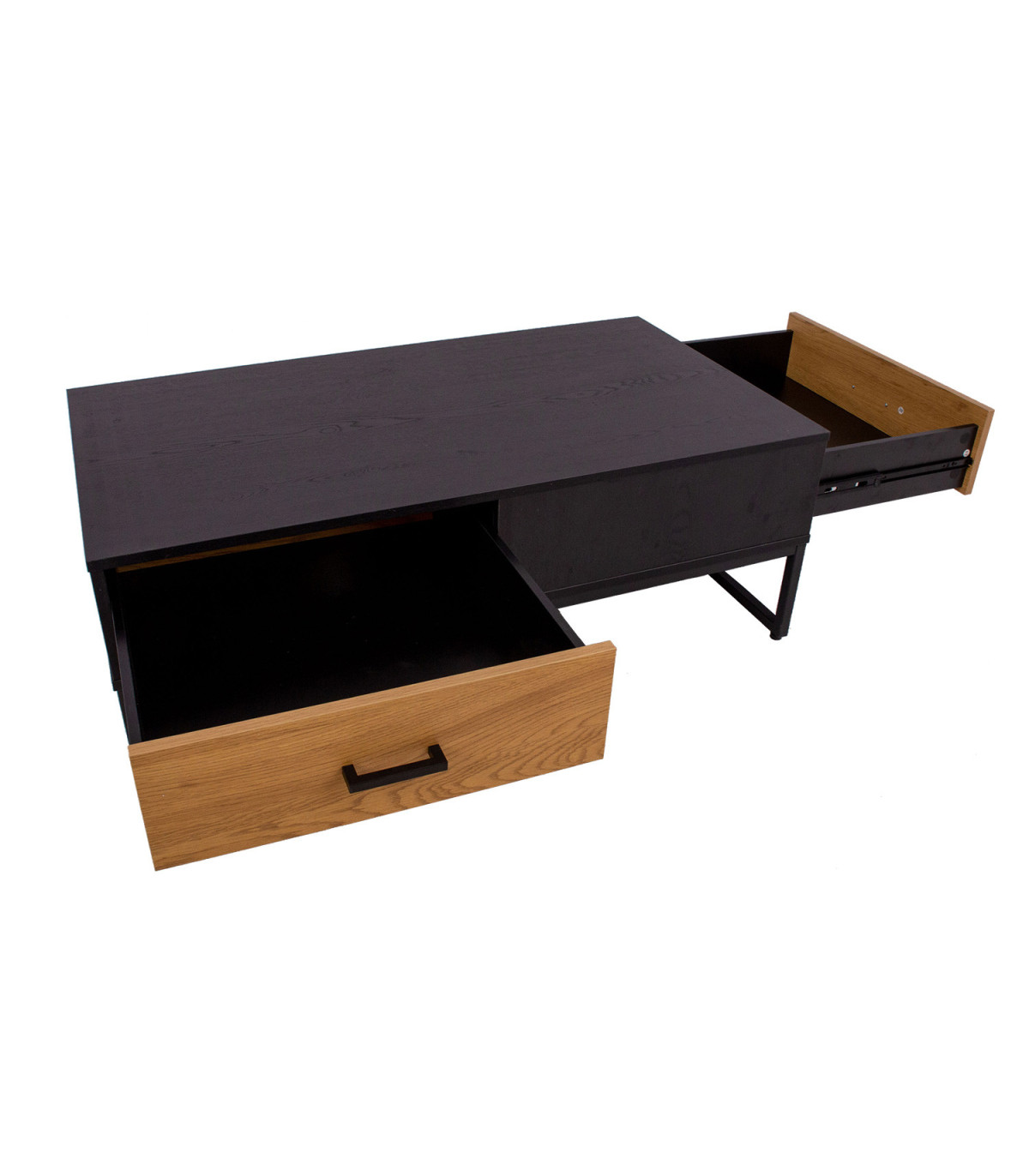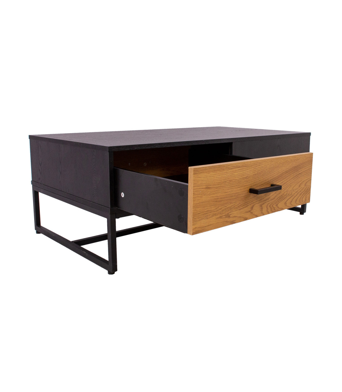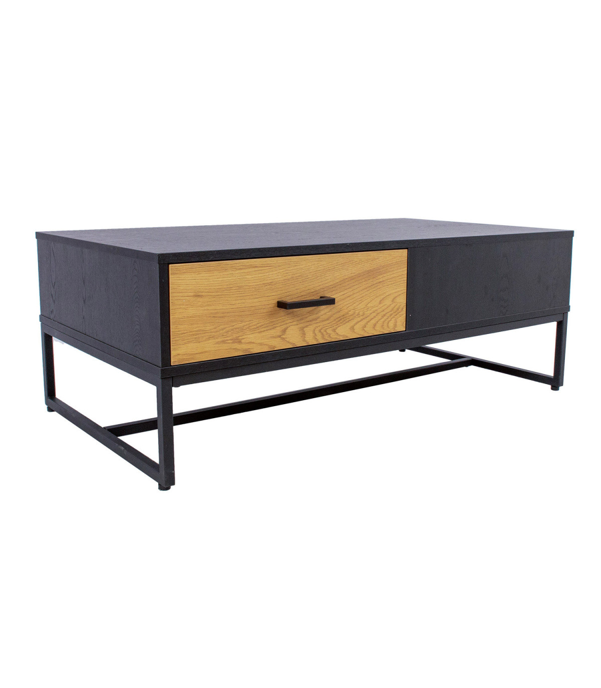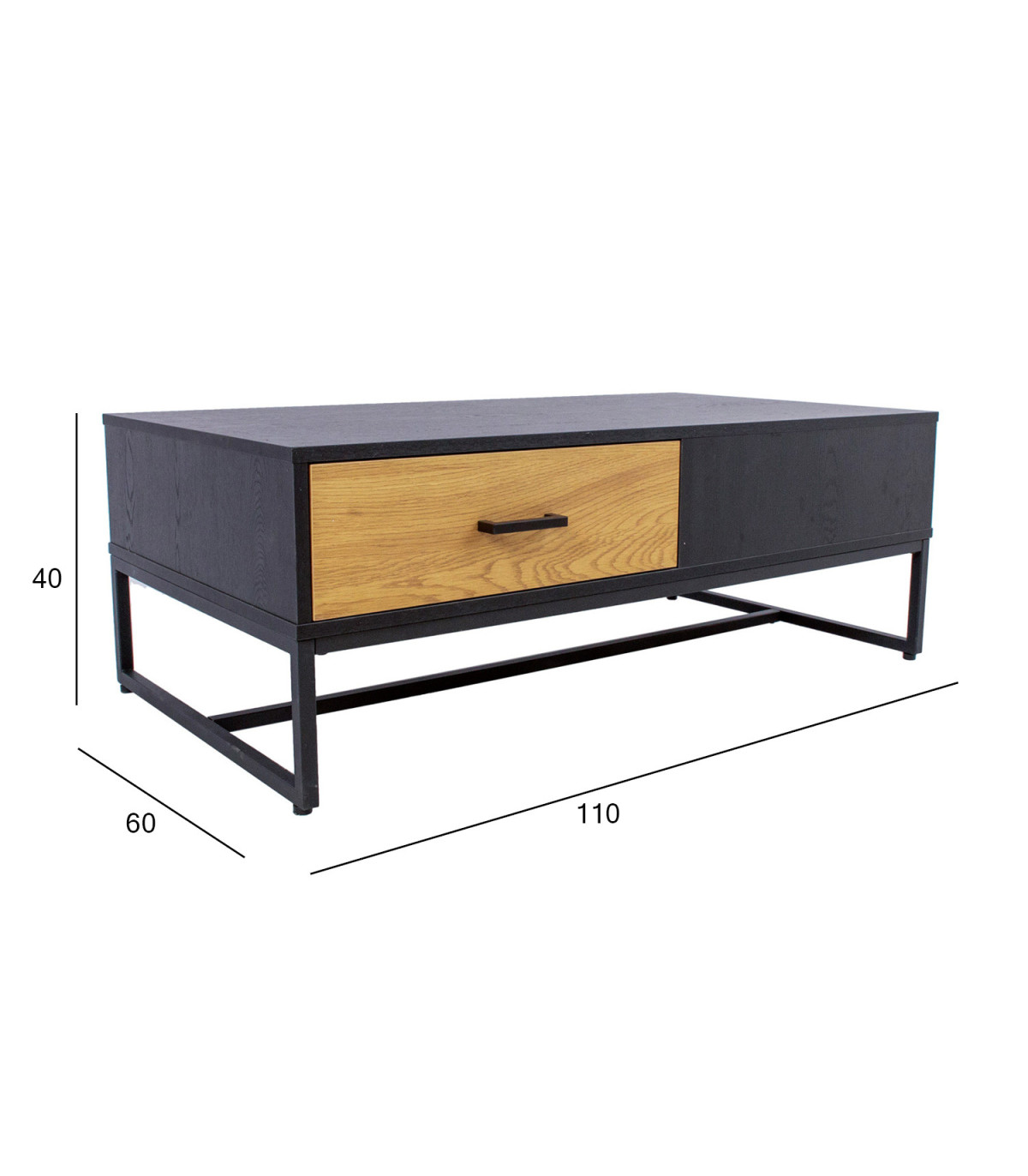 Журнальный столик AMSTERDAM 110x60xH40см. Материал: меламиновая плита, цвет: дуб/черный. Основание из черного металла. Плавно закрывающийся ящик. Черные алюминиевые ручки.