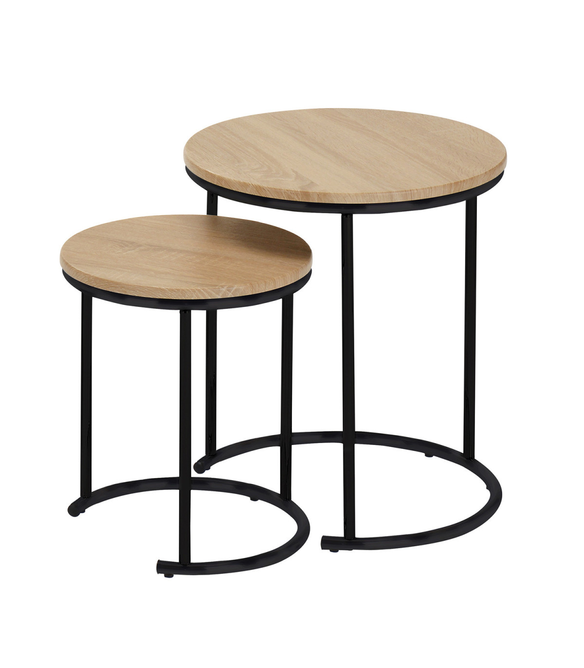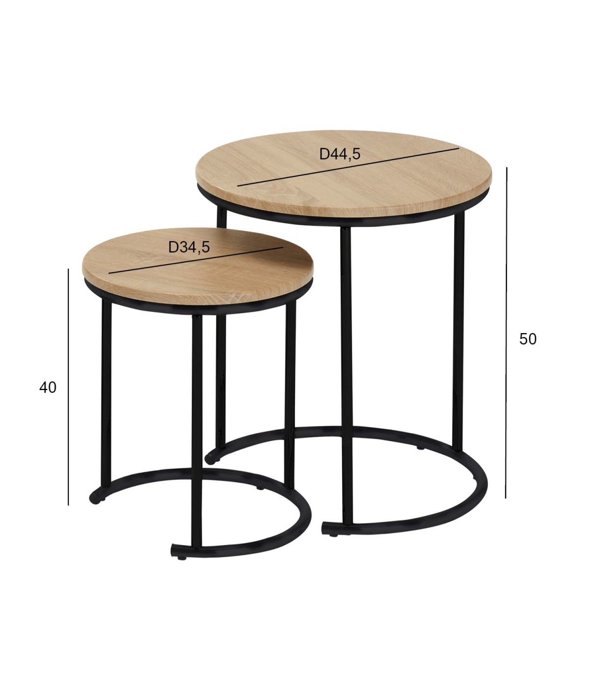 Вспомогательный столик ELTO дуб. Набор вспомогательных столиков выполнен со вкусом и отлично подходит для повседневного использования, а также делает размещение гостей более удобным.. Столешницы изготовлены из ламината с отделкой под дуб. Ножки стальных трубок покрыты порошковой краской черного цвета. Размеры большего вспомогательнова столика составляют D44,5xH50см, а размеры меньшего вспомогательнова столика - D34,5xH40см.