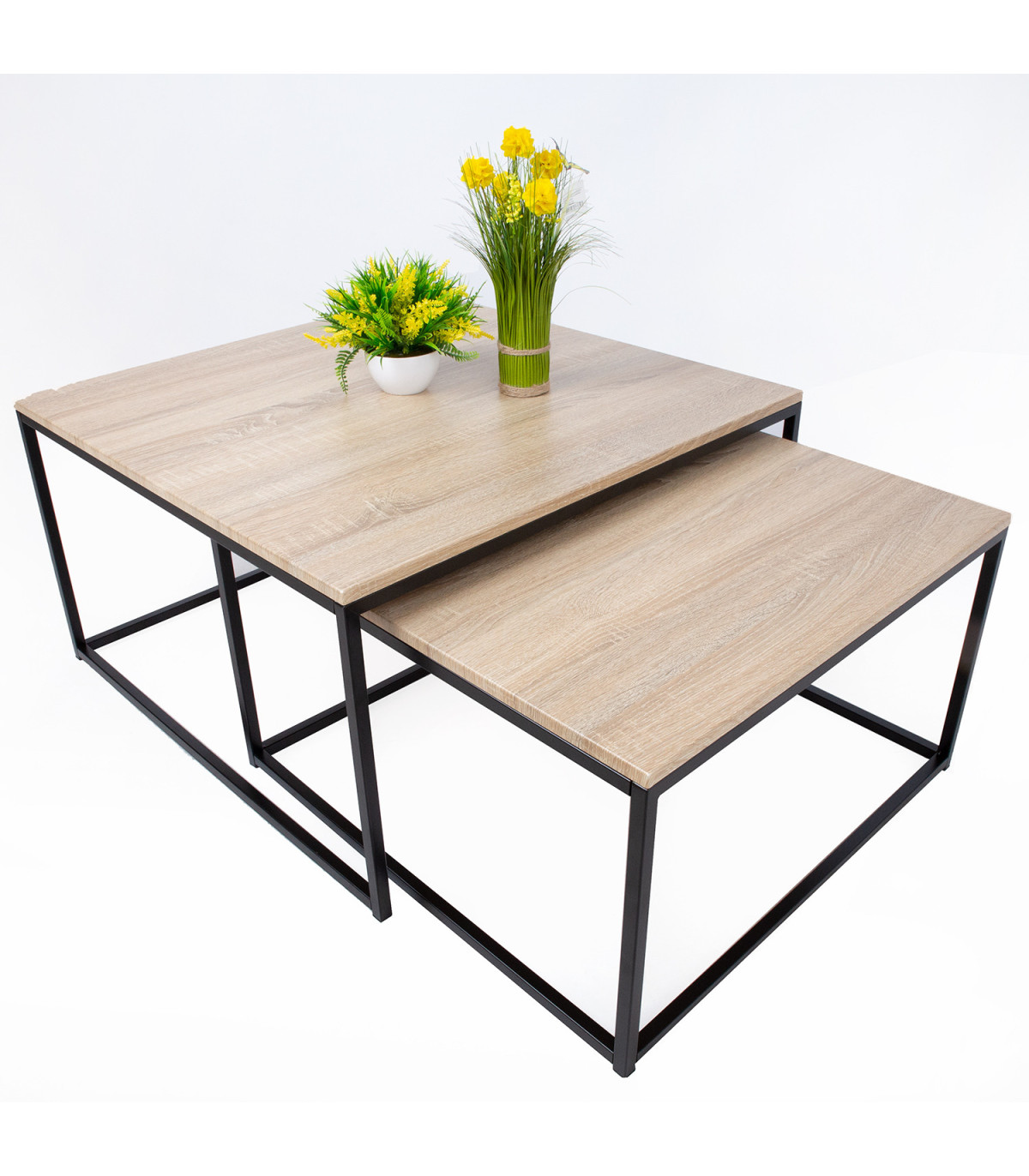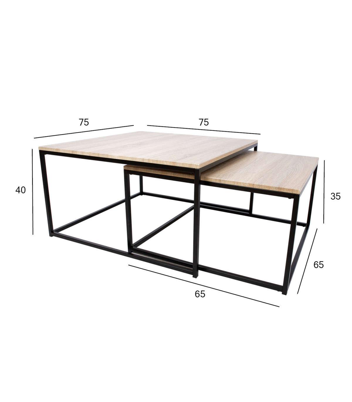 Журнальный столик ELT светло-коричневый. Набор журнальных столиков оформлен со вкусом и отлично подходит для повседневного использования, а также делает размещение гостей более удобным. Столешницы изготовлены из ламината с отделкой под дуб. Ножки стальных трубок покрыты порошковой краской черного цвета. Размеры большего журнального столика - 75x75xH40 см, а меньшего - 65x65xH35 см.
