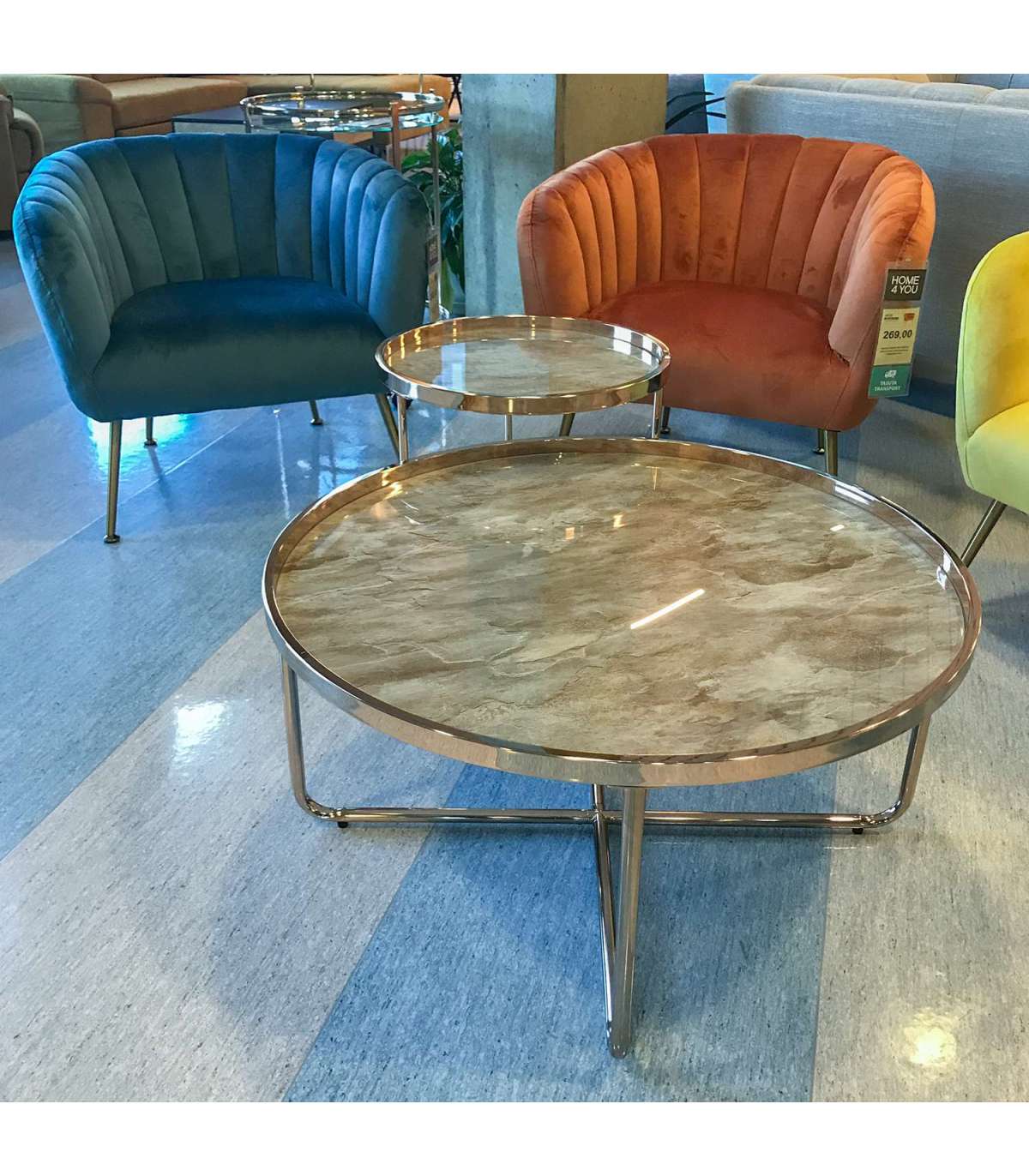 Журнальный столик ASTOR золотистый. Со вкусом оформленный журнальный столик отлично подходит для повседневного использования, а также делает размещение гостей более удобным. Столешница изготовлена из закаленного стекла толщиной 5 мм с элегантным мраморным рисунком. Ножки из стальных трубок покрыты золотым покрытием. Размеры журнального столика D80xH40см.