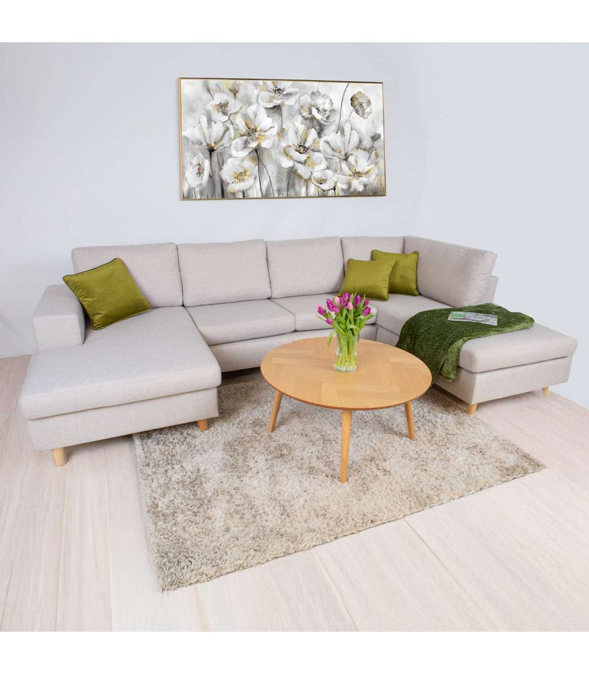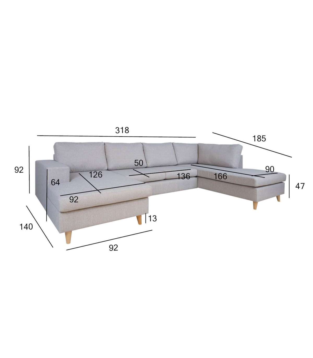 Угловой диван HARALD правый угол, бежевый. Большой U-образный угловой диван очаровывает своим четким и нейтральным дизайном и прекрасно вписывается в разные стили и дизайны интерьеров. Диван с красивыми мягкими подушками является лучшим местом для отдыха и может вместить много людей, если это необходимо. Каркас дивана изготовлен из березовой фанеры и массива дерева. Удобство сидения обеспечивают зигзагообразные пружины. Все подушки сидений свободны. Внутри подушек сиденья находится прочная пластина из пеноматериала HR, покрытая мягким полиэфирным волокном. Свободные подушки спинки наполнены измельченным поролоном. Чехлы подушек сиденья и спинки снимаются и их можно стирать. Корпус и подушки дивана обтянуты высококачественной мебельной тканью, номиналом по Мартиндейлу 90 000 - 100 000. Габаритные размеры дивана 318x140/185xH92см. Более длинный угол находится справа на виде спереди. Высота дивана до края рамы 73см. Высота сиденья 47см. Глубина сиденья 50см. Размеры подушек сиденья: 90/70x167xH15см, 93/68x126xH15см. Размеры подушек среднего сиденья 70x65xH15см/2шт. Размеры подушек спинки: 70x48x18см/3шт, 97/83x48x18см/1шт и 80/68x48xH18см/1шт. У дивана деревянные ножки. Высота ножек от земли 13см. Диван произведен в Эстонии.