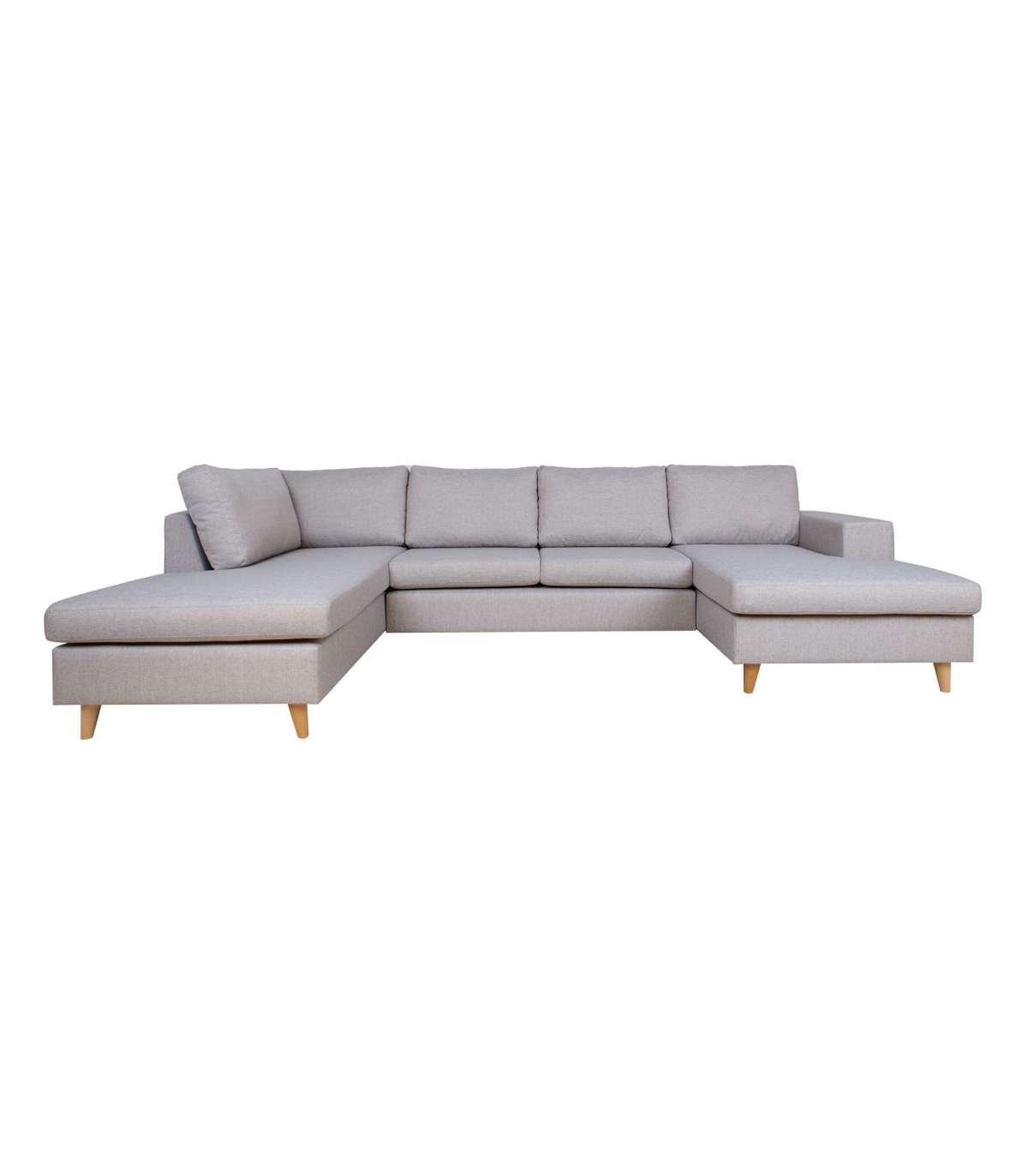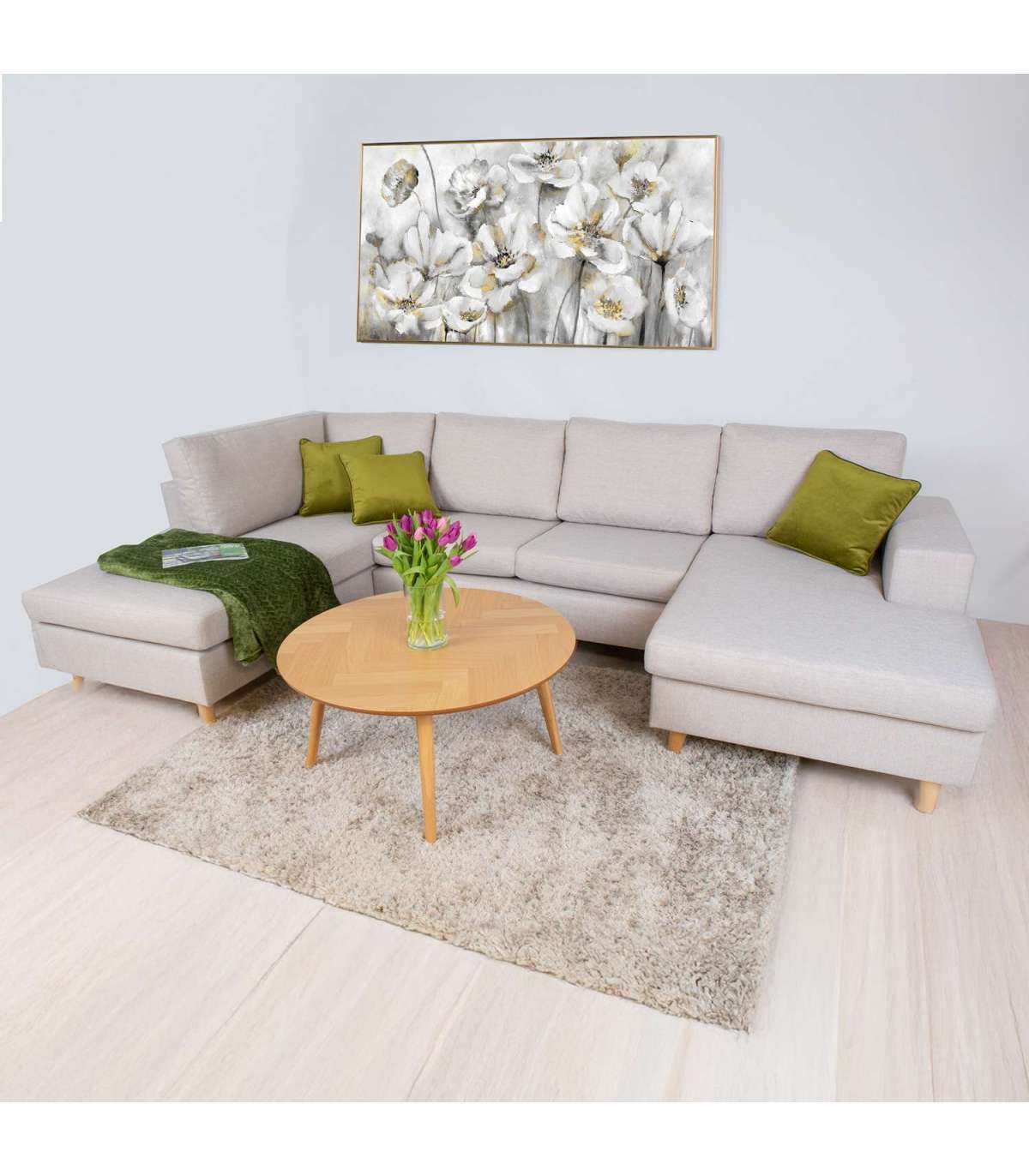 Угловой диван HARALD левый угол, бежевый. Большой U-образный угловой диван очаровывает своим четким и нейтральным дизайном и прекрасно вписывается в разные стили и дизайны интерьеров. Диван с красивыми мягкими подушками является лучшим местом для отдыха и может вместить много людей, если это необходимо. Каркас дивана изготовлен из березовой фанеры и массива дерева. Удобство сидения обеспечивают зигзагообразные пружины. Все подушки сидений свободны. Внутри подушек сиденья находится прочная пластина из пеноматериала HR, покрытая мягким полиэфирным волокном. Свободные подушки спинки наполнены измельченным поролоном. Чехлы подушек сиденья и спинки снимаются и их можно стирать. Корпус и подушки дивана обтянуты высококачественной мебельной тканью, номиналом по Мартиндейлу 90 000 - 100 000. Габаритные размеры дивана 318x140/185xH92см. Более длинный угол находится справа на виде спереди. Высота дивана до края рамы 73см. Высота сиденья 47см. Глубина сиденья 50см. Размеры подушек сиденья: 90/70x167xH15см, 93/68x126xH15см. Размеры подушек среднего сиденья 70x65xH15см/2шт. Размеры подушек спинки: 70x48x18см/3шт, 97/83x48x18см/1шт и 80/68x48xH18см/1шт. У дивана деревянные ножки. Высота ножек от земли 13см. Диван произведен в Эстонии.