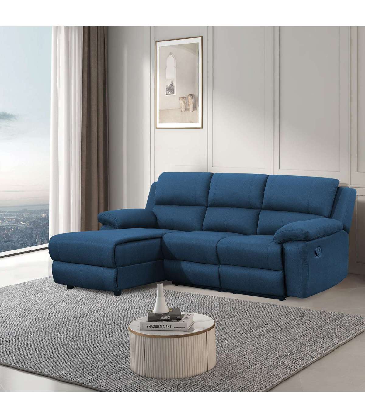 Nurgadiivan BERIT VN, tumesinine. Diivani äärmise istme jalatoe asend on reguleeritav manuaalse mehhanismi abil. Jalatuge üles tõstes liigub seljatugi sujuvalt kaasa. Jalatoe tõstmiseks tõmmake tooli paremal välisküljel asuv kang üles. Surudes jalatuge alla fikseerub see automaatselt algasendisse. Diivani kattematerjal: 100% polüesterkangas. Polsterdus: polüuretaanvaht 25-28kg/m³. Karkass ja vedrustus: puit, vineer, metall, pocket vedrud. Diivanil on plastikust jalad. Diivani üldmõõdud on 214x160/95xH98cm. Istme sügavus 53cm, ühe istumiskoha laius 48cm, istme kõrgus 49cm. Käetoe kõrgus maast 62cm.