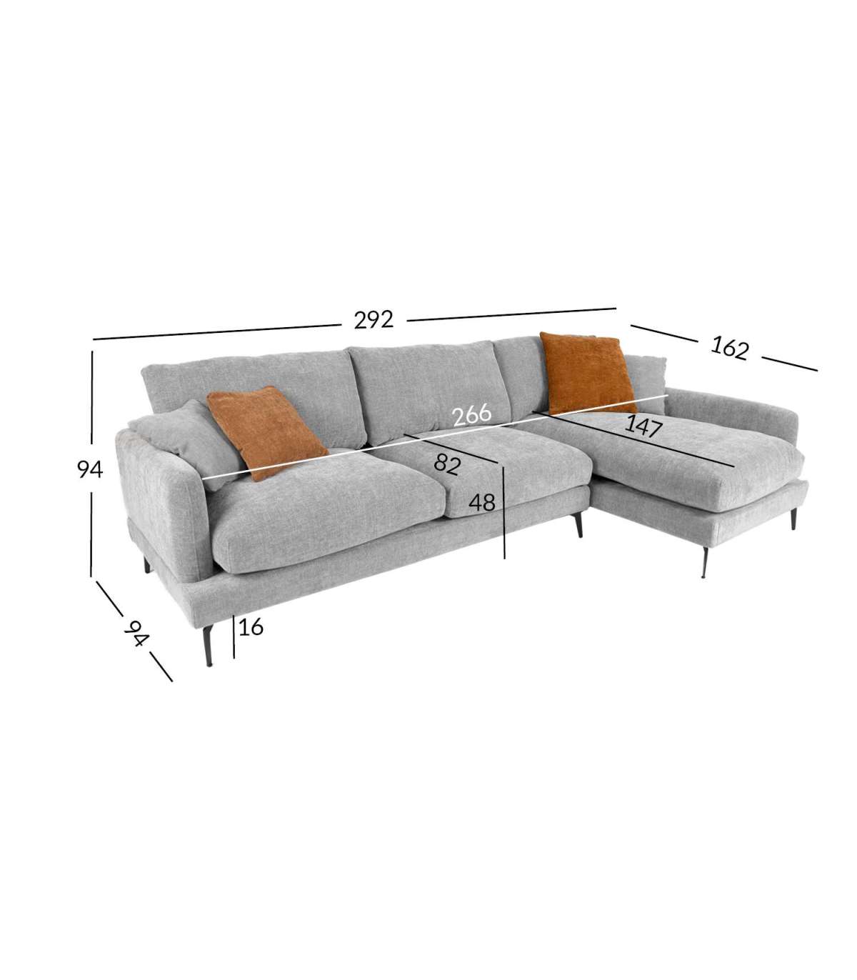 Diivani üldmõõdud on 292x94/162xH94cm. Istme laius 266cm, istme sügavus 82/147cm, istme kõrgus 48cm.