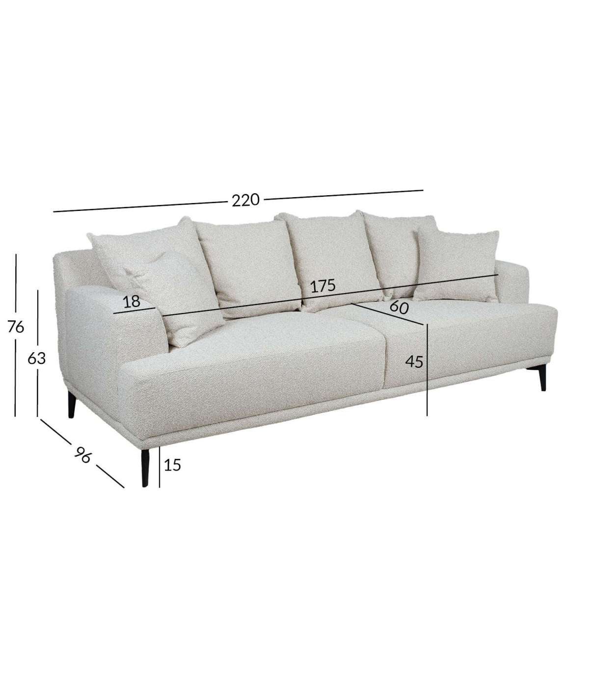 Diivani üldmõõdud on 220x96xH76cm. Istme laius 175cm, istme sügavus 60/75cm, istme kõrgus 45cm. Käetoe kõrgus maast 63cm, käetoe laius 18cm.