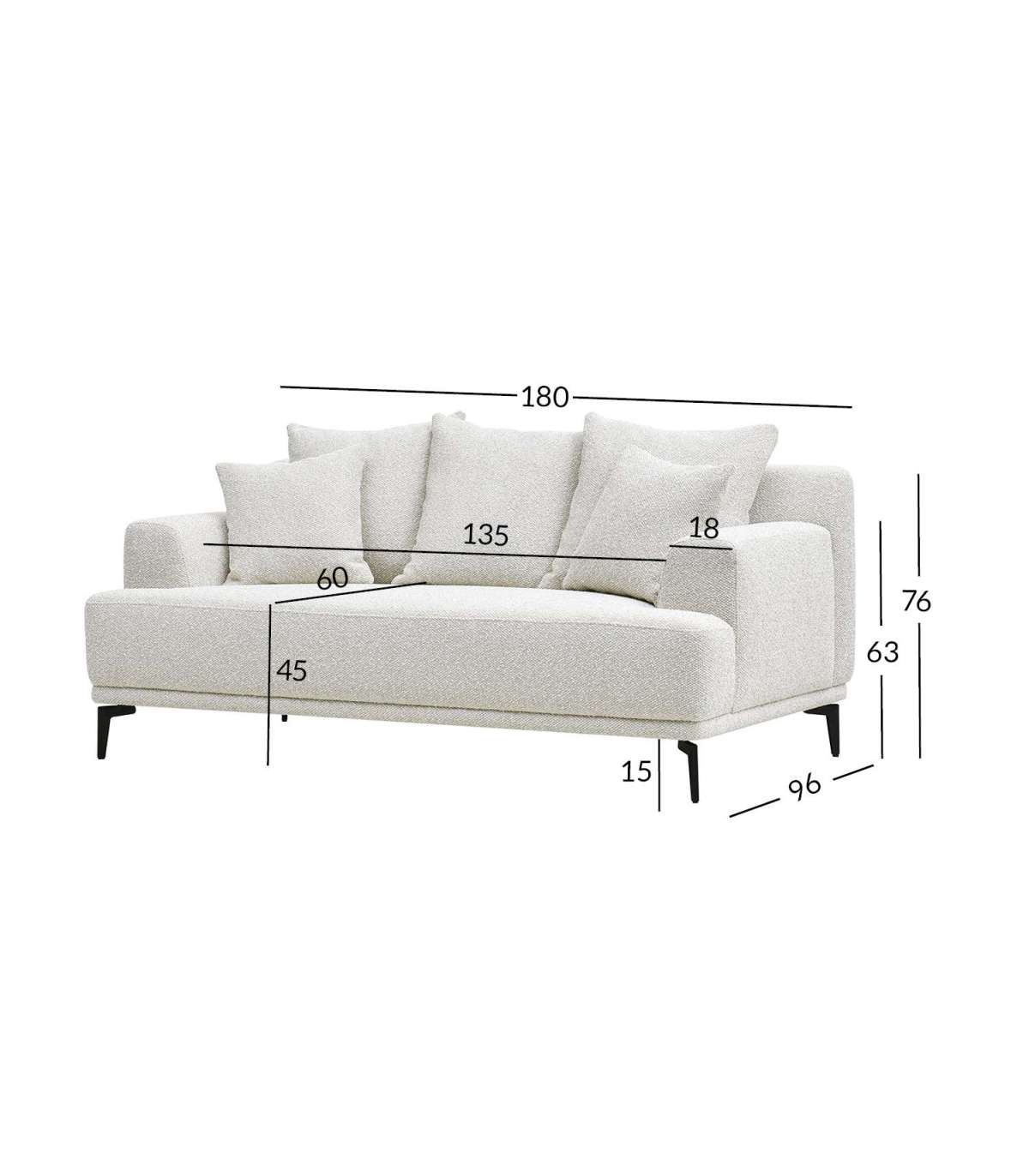 Diivani üldmõõdud on 180x96xH76cm. Istme laius 135cm, istme sügavus 60/75cm, istme kõrgus 45cm. Käetoe kõrgus maast 63cm, käetoe laius 18cm.