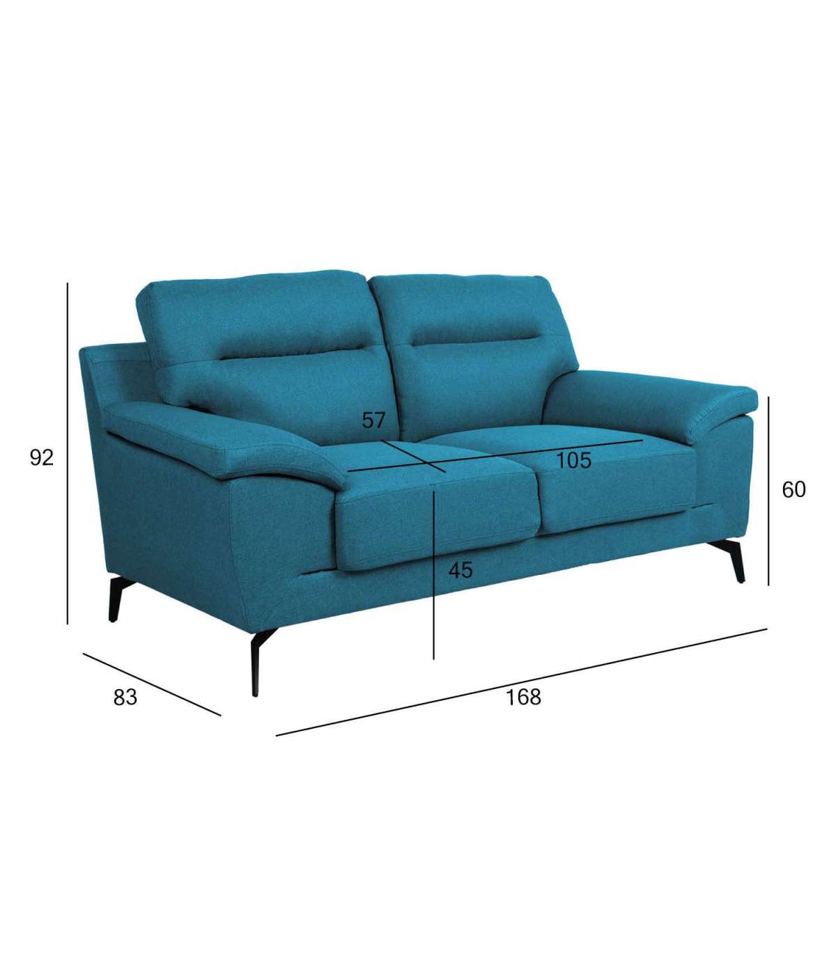 Diivan ENZO 2-kohaline, meresinine. Diivani karkass on valmistatud täispuidust ja vineerist. Polsterduseks on kasutaud polüuretaanvahtu tihedusega 25kg/m³. Istme sees on pocket vedruplokk. Lahtised seljatoepadjad kinnituvad seljatoe külge tõmbluku ja takjaribaga. Padjad on täidetud polüesterkiuga. Diivani kattematerjal: 100% polüesterkangagas. Diivani üldmõõdud on 168x83xH92cm. Istme laius 105cm, istme sügavus 57cm, istme kõrgus 45cm. Käetoe kõrgus maast 60cm, käetoe laius 32cm. Diivanil on tumedad metallist jalad H14cm.