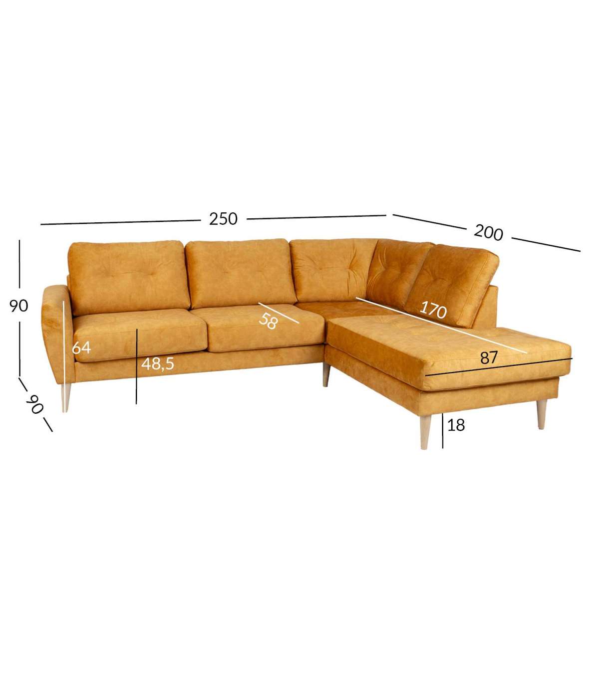 Diivani üldmõõdud on 250x200/90xH90cm. Istme kõrgus 48,5cm. Istme sügavus 170/58cm. Nurgaosa laius 87cm. Käetoe kõrgus maast 64cm.