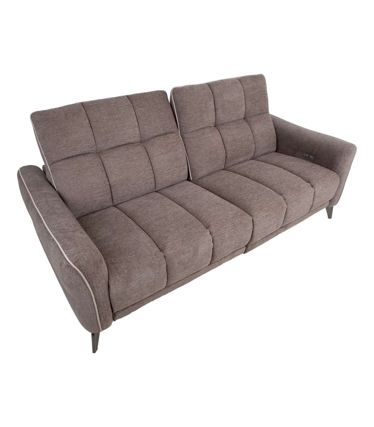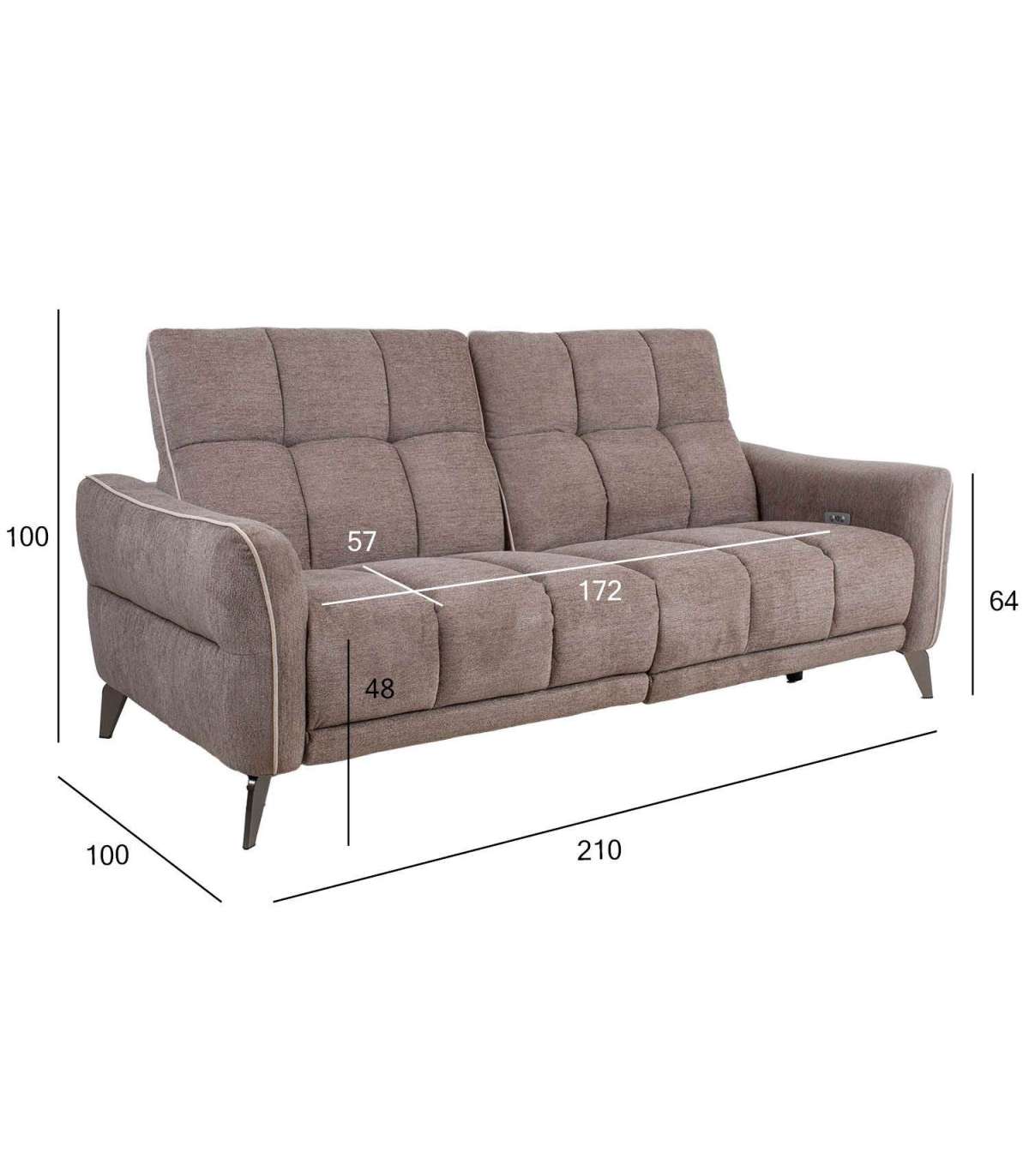 Diivan CATHY 3-kohaline elektriline recliner, helepruun beeži kandiga. Kaasaegse pehme mööbli juures on funktsionaalsus sama oluline, kui välimus ja mugavus. Reguleeritavad pea- ja jalatoed ning USB port tagavad suurepärase kasutamismugavuse. Diivani peatoed liiguvad üles-alla manuaalse mehhanismi abil. Jala- ja seljatoe asend on reguleeritav elektrilise mehhanismiga. Diivani karkass on valmistatud puidust ja vineerist. Polsterduseks on kasutatud polüuretaanvahtu. Diivan on üleni kaetud polüesterkangaga. Diivani üldmõõdud on 210x100xH100cm. Istme laius 86+86cm, istme sügavus 57cm, istme kõrgus 48cm. Käetoe kõrgus maast 64cm. Diivanil on tumedad metallist jalad H14cm.