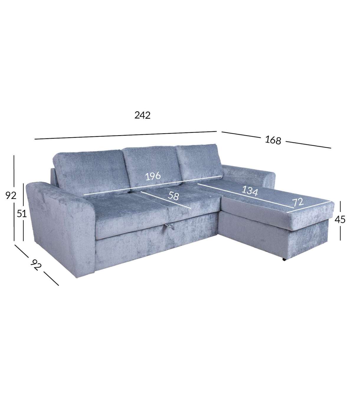 Diivani üldmõõdud on 242x168/92xH92cm. Diivani kõrgus raami ääreni 73cm. Istme kõrgus 45cm. Istme sügavus 58cm. Seljatoepadja mõõdud on 64x48x18cm. Magamisosa mõõdud avatuna 147x196cm. Diivani jalad on mustast plastikust.